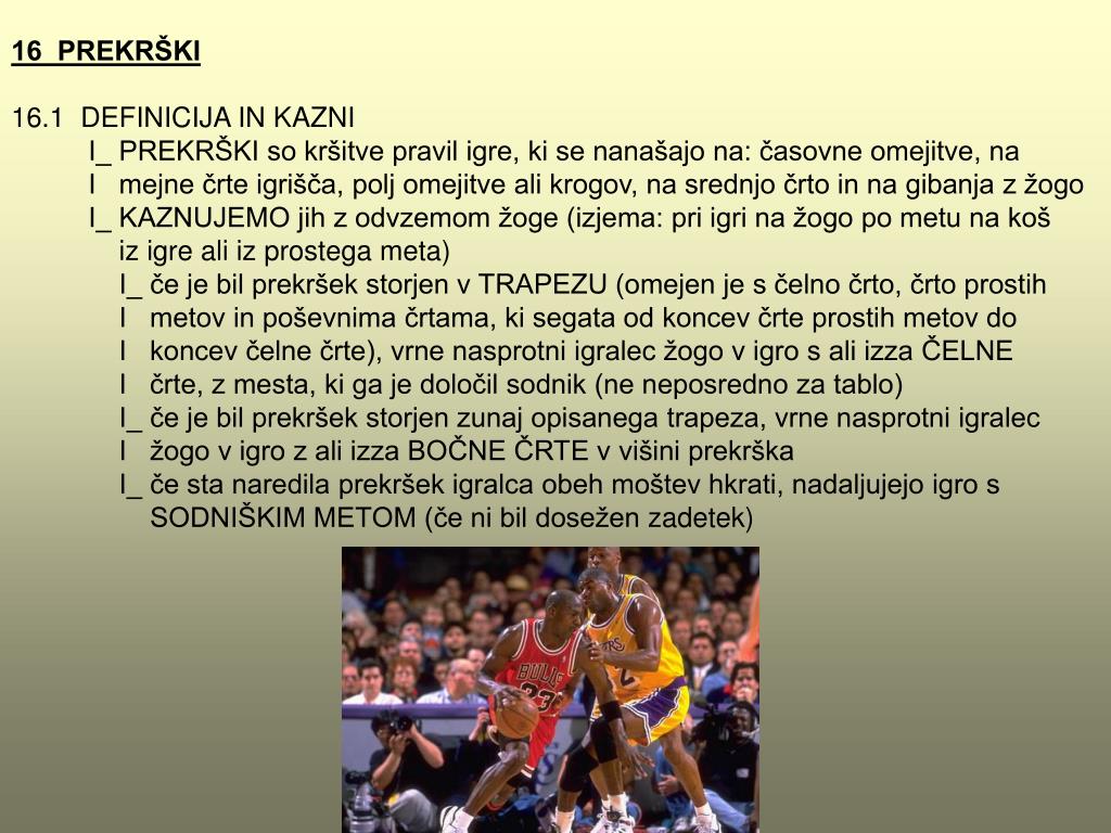 16 PREKRŠKI 16.1 DEFINICIJA IN KAZNI I_ PREKRŠKI so kršitve pravil igre, ki se nanašajo na: časovne omejitve, na I mejne črte igrišča, polj omejitve ali krogov, na srednjo črto in na gibanja z žogo I_ KAZNUJEMO jih z odvzemom žoge (izjema: pri igri na žogo po metu na koš iz igre ali iz prostega meta) I_ če je bil prekršek storjen v TRAPEZU (omejen je s čelno črto, črto prostih I metov in poševnima črtama, ki segata od koncev črte prostih metov do I koncev čelne črte), vrne nasprotni igralec žogo v igro s ali izza ČELNE I črte, zmesta, ki ga je določil sodnik (ne neposredno za tablo) I_ če je bil prekršek storjen zunaj opisanega trapeza, vrne nasprotni igralec I žogo v igro z ali izza BOČNE ČRTE vvišini prekrška I_ če sta naredila prekršek igralca obeh moštev hkrati, nadaljujejo igro s SODNIŠKIM METOM (če ni bil doseženzadetek)