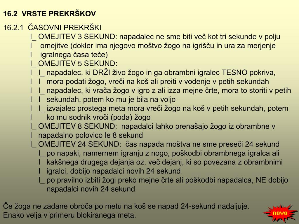 16.2 VRSTE PREKRŠKOV 16.2.1 ČASOVNI PREKRŠKI I_ OMEJITEV 3 SEKUND: napadalec ne sme biti več kot tri sekunde v polju I omejitve (dokler ima njegovo moštvo žogo na igrišču in ura za merjenje I igralnega časa teče) I_ OMEJITEV 5 SEKUND: I I_ napadalec, ki DRŽI živo žogo in ga obrambni igralec TESNO pokriva, I I mora podati žogo, vreči na koš ali preiti v vodenje v petih sekundah I I_ napadalec, ki vrača žogo v igro z ali izza mejne črte, mora to storiti v petih I I sekundah, potem ko mu je bilana voljo I I_ izvajalec prostega meta mora vreči žogo na koš v petih sekundah, potem I ko mu sodnik vroči (poda) žogo I_ OMEJITEV 8 SEKUND: napadalci lahko prenašajo žogo iz obrambne v I napadalno polovico le 8 sekund I_ OMEJITEV 24 SEKUND: čas napada moštva ne sme preseči 24 sekund I_ po napaki, namernem igranju z nogo, poškodbi obrambnega igralca ali I kakšnega drugega dejanja oz. več dejanj, ki so povezana z obrambnimi I igralci, dobijo napadalci novih 24 sekund I_ po pravilno izbiti žogi preko mejne črte ali poškodbi napadalca, NE dobijo napadalci novih 24 sekund Če žoga ne zadane obroča po metu na koš se napad 24-sekund nadaljuje. Enako velja v primeru blokiranega meta.