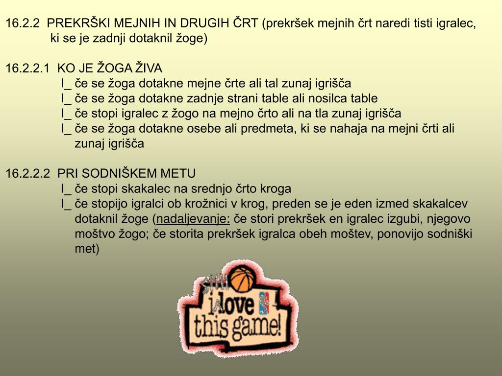 16.2.2 PREKRŠKI MEJNIH IN DRUGIH ČRT (prekršek mejnih črt naredi tisti igralec, ki se je zadnji dotaknil žoge) 16.2.2.1 KO JE ŽOGA ŽIVA I_ če se žoga dotakne mejne črte ali tal zunaj igrišča I_ če se žoga dotakne zadnje strani table ali nosilca table I_ če stopi igralec z žogo na mejno črto ali na tla zunaj igrišča I_ če se žoga dotakne osebe ali predmeta, ki se nahaja na mejni črti ali zunaj igrišča 16.2.2.2 PRI SODNIŠKEM METU I_ če stopi skakalec na srednjo črto kroga I_ če stopijo igralci ob krožnici v krog, preden se je eden izmed skakalcev dotaknil žoge (nadaljevanje: če stori prekršek en igralec izgubi, njegovo moštvo žogo; če storita prekršek igralca obeh moštev, ponovijo sodniški met)