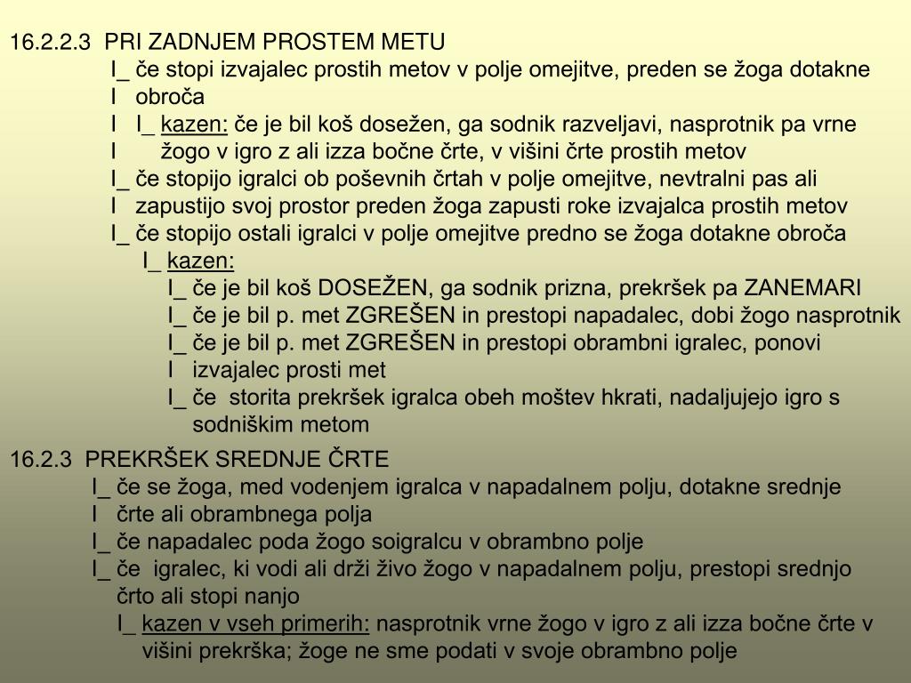 16.2.2.3 PRI ZADNJEM PROSTEM METU I_ če stopi izvajalec prostih metov v polje omejitve, preden se žoga dotakne I obroča I I_ kazen: če je bil koš dosežen, ga sodnik razveljavi, nasprotnik pa vrne I žogo v igro z ali izza bočne črte, vvišini črte prostih metov I_ če stopijo igralci ob poševnih črtah v polje omejitve, nevtralni pas ali I zapustijo svoj prostor preden žoga zapusti roke izvajalca prostih metov I_ če stopijo ostali igralci v polje omejitve predno se žogadotakne obroča I_ kazen: I_ če je bil koš DOSEŽEN, ga sodnik prizna, prekršek pa ZANEMARI I_ če je bil p. met ZGREŠEN in prestopi napadalec, dobi žogo nasprotnik I_ če je bil p. met ZGREŠEN in prestopi obrambni igralec, ponovi I izvajalec prosti met I_ če storita prekršek igralca obeh moštev hkrati, nadaljujejo igro s sodniškim metom 16.2.3 PREKRŠEK SREDNJE ČRTE I_ če se žoga, med vodenjem igralca v napadalnem polju, dotakne srednje I črte ali obrambnega polja I_ če napadalec poda žogo soigralcu v obrambno polje I_ če igralec, ki vodi ali drži živo žogo v napadalnem polju, prestopi srednjo črto ali stopi nanjo I_kazen v vseh primerih: nasprotnik vrne žogo v igro z ali izza bočne črte v višini prekrška; žoge ne sme podati v svoje obrambno polje