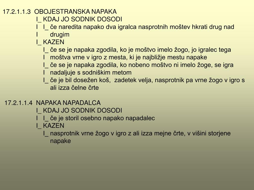 16.2.4.3 PRI PROSTIH METIH I_ če izvajalec vara prosti met I_ kadar se igralci, po prostem metu, ki mu sledi naslednji prosti met, I dotaknejo žoge, dokler je še možnost, da bopadla v koš I I_ kazen: dotik napadalca 0 točk, dotik obrambnegaigralca 1 točka I_ kadar se igralci, pri zadnjem ali edinem prostem metu, dotaknejo žoge, I ki leti proti košu, preden se ta dotakneobroča I I_ kazen: dotik napadalca 0 točk, dotik obrambnega igralca 1 točka in I njemu tehnična napaka I_ če se pri zadnjem prostem metu žoga ne dotakne obroča I_ kazen: nasprotnik vrne žogo v igro z ali izza bočne črte v višini črte prostih metov 17 NAPAKE (vsako napako vpiše zapisnikar v zapisnik) 17.1 DEFINICIJA IN KAZNI I_ NAPAKE so kršitve pravil igre, ki se nanašajo na nepravilno oviranje I nasprotnika ali nešportno obnašanje I_ KAZNUJEMO jih z odvzemom žoge (nasprotnik vrne žogo v igro z ali izza mejne črte v višini storjene napake), z enim ali več prostimi meti, izključitvijo in sodniškim metom
