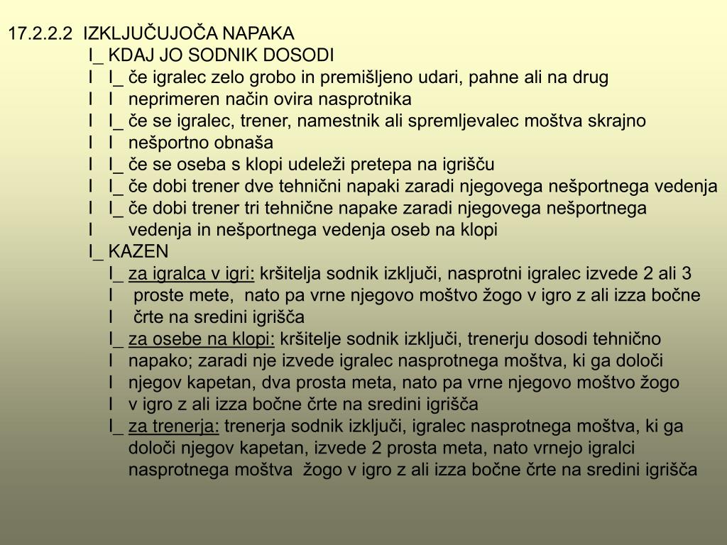 17.2.2.2 IZKLJUČUJOČA NAPAKA I_ KDAJ JO SODNIK DOSODI I I_ če igralec zelo grobo in premišljeno udari, pahne ali na drug I I neprimeren način ovira nasprotnika I I_ če se igralec, trener, namestnik ali spremljevalec moštva skrajno I I nešportno obnaša I I_ če se oseba s klopi udeleži pretepa na igrišču I I_ če dobi trener dve tehnični napaki zaradi njegovega nešportnega vedenja I I_ če dobi trener tri tehnične napake zaradi njegovega nešportnega I vedenja in nešportnega vedenja oseb naklopi I_ KAZEN I_ za igralca v igri: kršitelja sodnik izključi, nasprotni igralec izvede 2 ali 3 I proste mete, nato pa vrne njegovo moštvo žogo v igro z ali izza bočne I črte na sredini igrišča I_ za osebe na klopi: kršitelje sodnik izključi, trenerju dosodi tehnično I napako; zaradi nje izvede igralec nasprotnega moštva, ki ga določi I njegov kapetan, dva prosta meta, nato pa vrne njegovo moštvo žogo I v igro z ali izza bočnečrte na sredini igrišča I_ za trenerja: trenerja sodnik izključi, igralec nasprotnega moštva, ki ga določi njegov kapetan, izvede 2 prosta meta, nato vrnejo igralci nasprotnega moštva žogo v igro z ali izza bočne črte na sredini igrišča