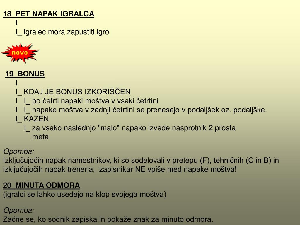 18 PET NAPAK IGRALCA I I_ igralec mora zapustiti igro 19 BONUS I I_ KDAJ JE BONUS IZKORIŠČEN I I_ po četrti napaki moštva v vsaki četrtini I I_ napake moštva v zadnji četrtini se prenesejo v podaljšek oz. podaljške. I_ KAZEN I_ za vsako naslednjo "malo" napako izvede nasprotnik 2 prosta meta Opomba: Izključujočih napak namestnikov, ki so sodelovali v pretepu (F), tehničnih (C in B) in izključujočih napak trenerja, zapisnikar NE vpiše med napake moštva! 20 MINUTA ODMORA (igralci se lahko usedejo na klop svojega moštva) Opomba: Začne se, ko sodnik zapiska in pokaže znak za minuto odmora.