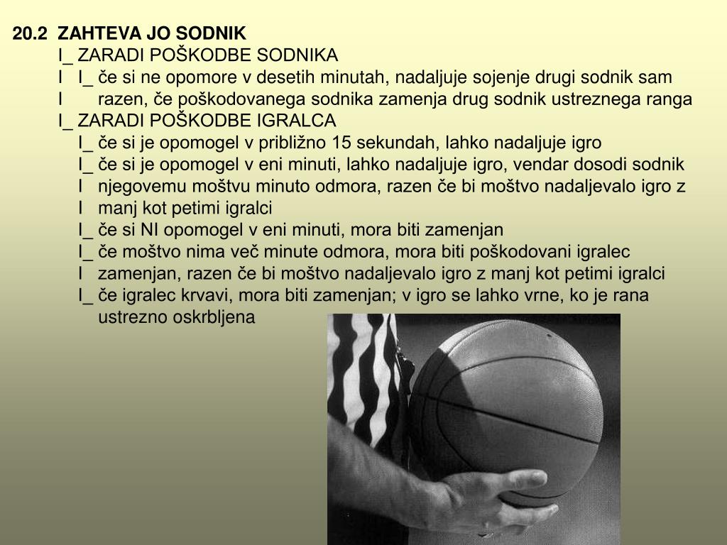 20.2 ZAHTEVA JO SODNIK I_ ZARADI POŠKODBE SODNIKA I I_ če si ne opomore v desetih minutah, nadaljuje sojenje drugi sodnik sam I razen, če poškodovanega sodnika zamenja drug sodnik ustreznega ranga I_ ZARADI POŠKODBE IGRALCA I_ če si je opomogel v približno 15 sekundah, lahko nadaljuje igro I_ če si je opomogel v eni minuti, lahko nadaljuje igro, vendar dosodi sodnik I njegovemu moštvu minuto odmora, razen če bi moštvo nadaljevalo igro z I manj kot petimi igralci I_ če si NI opomogel v eni minuti, mora biti zamenjan I_ če moštvo nima več minute odmora, mora biti poškodovani igralec I zamenjan, razen če bi moštvo nadaljevalo igro z manj kot petimi igralci I_ če igralec krvavi, mora biti zamenjan; v igro se lahko vrne, ko je rana ustrezno oskrbljena