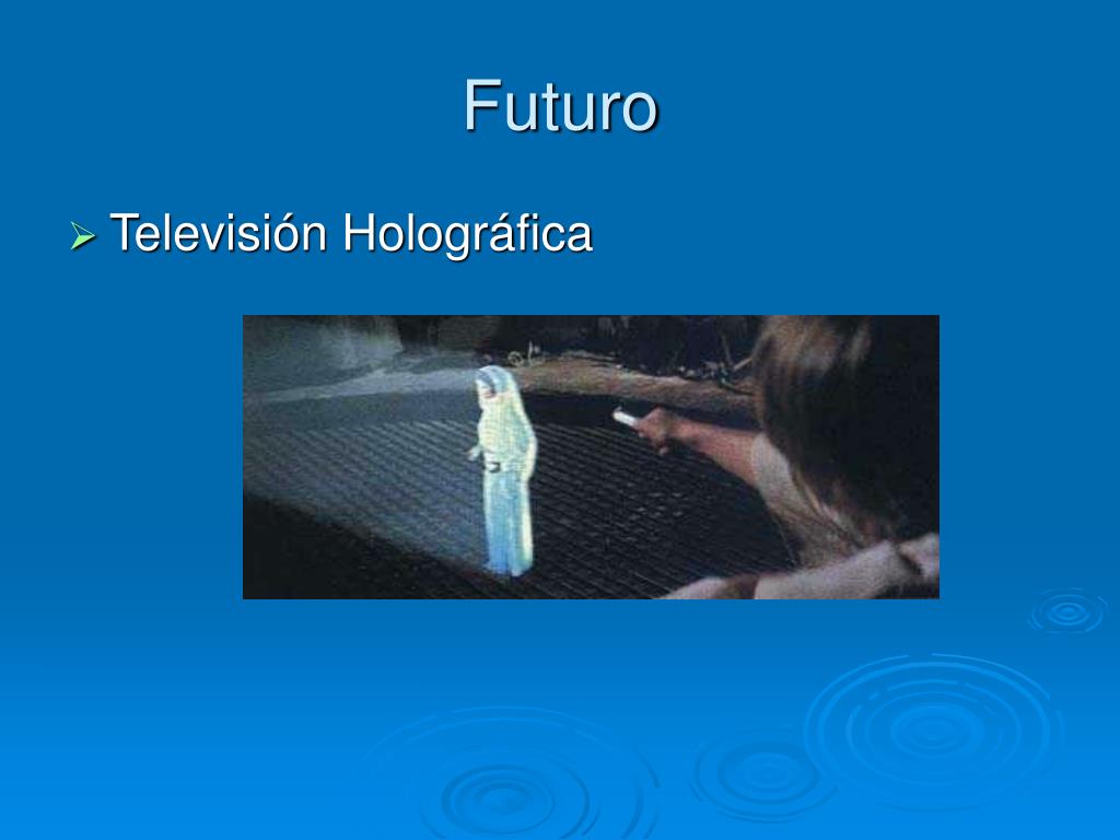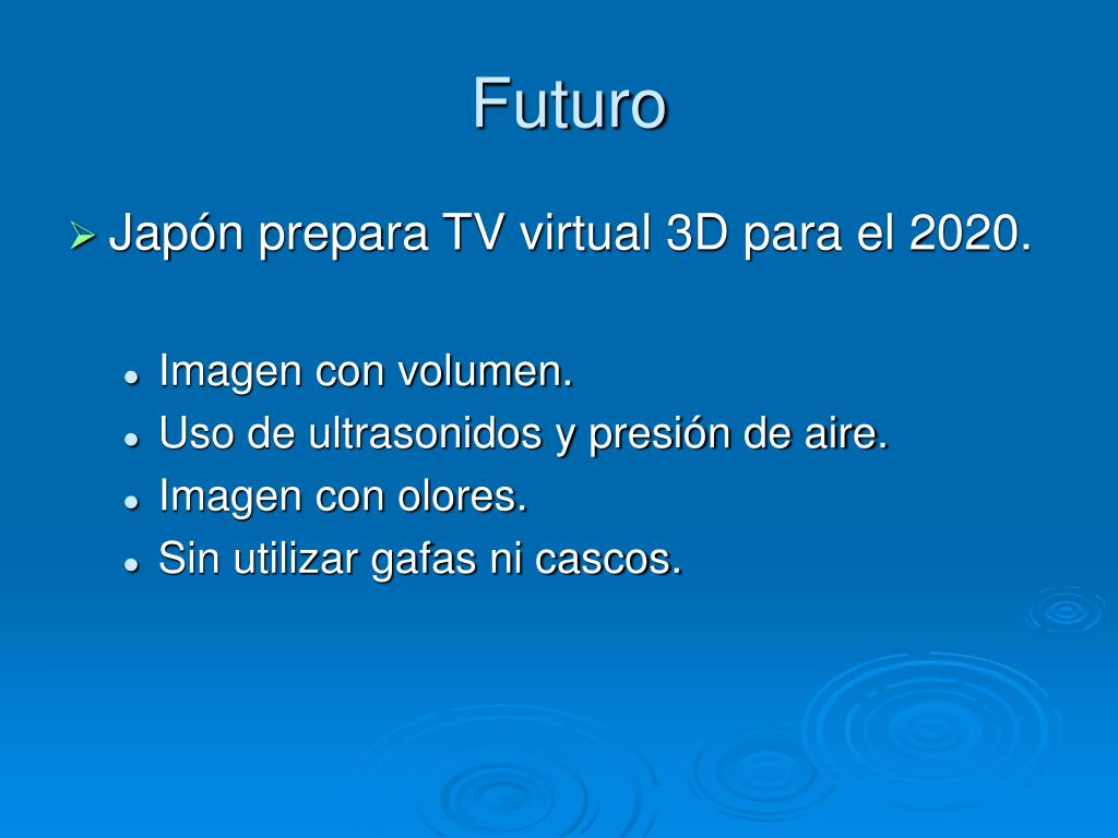 Futuro • Japón prepara TV virtual 3D para el 2020. • Imagen con volumen. • Uso de ultrasonidos y presión de aire. • Imagen con olores. • Sin utilizar gafas ni cascos.