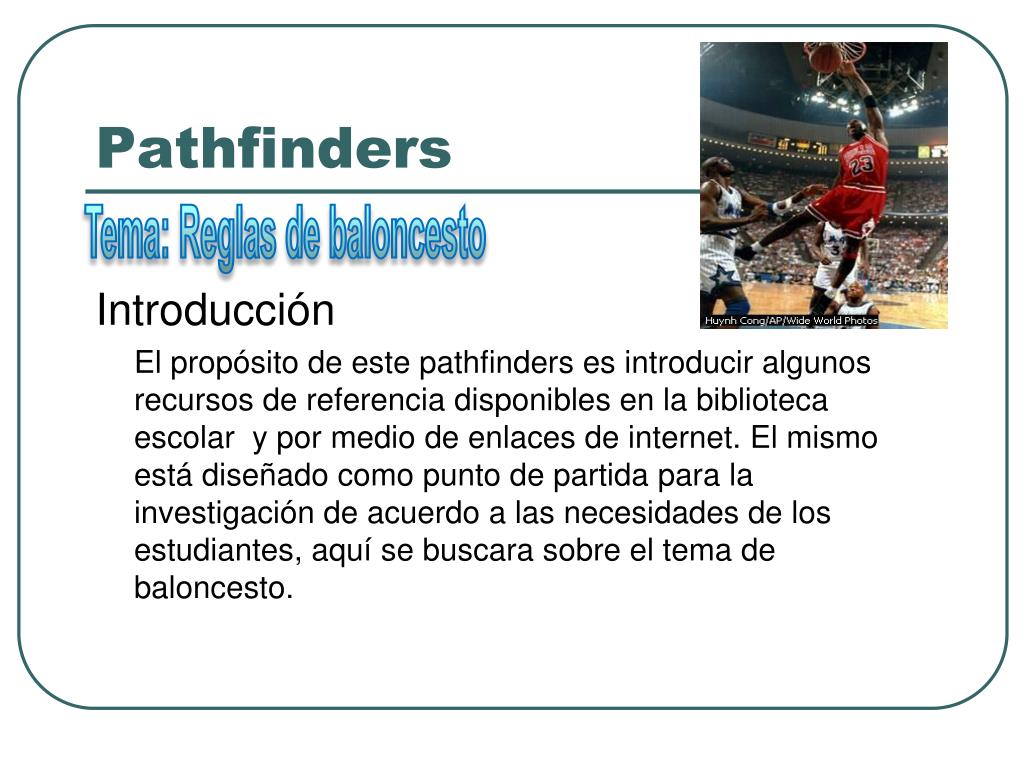 Pathfinders Tema: Reglas de baloncesto Introducción El propósito de este pathfinders es introducir algunos recursos de referencia disponibles en la biblioteca escolar y por medio de enlaces de internet. El mismo está diseñado como punto de partida para la investigación de acuerdo a las necesidades de los estudiantes, aquí se buscara sobre el tema de baloncesto.