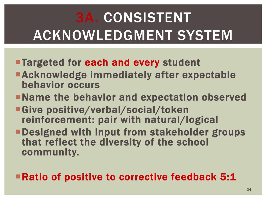 3a. Consistent acknowledgment system • Targeted for each and every student • Acknowledge immediately after expectable behavior occurs • Name the behavior and expectation observed • Give positive/verbal/social/token reinforcement: pair with natural/logical • Designed with input from stakeholder groups that reflect the diversity of the school community. • Ratio of positive to corrective feedback 5:1