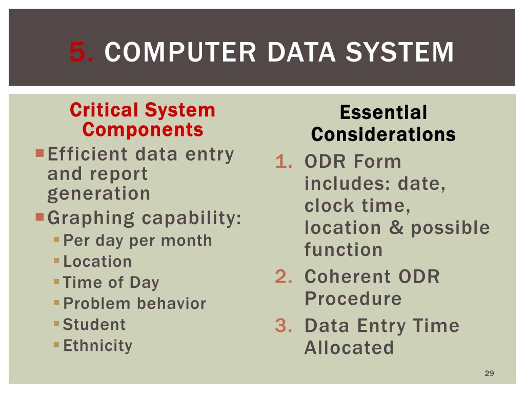 5. Computer data system Essential Considerations • ODR Form includes: date, clock time, location & possible function • Coherent ODR Procedure • Data Entry Time Allocated Critical System Components • Efficient data entry and report generation • Graphing capability: • Per day per month • Location • Time of Day • Problem behavior • Student • Ethnicity