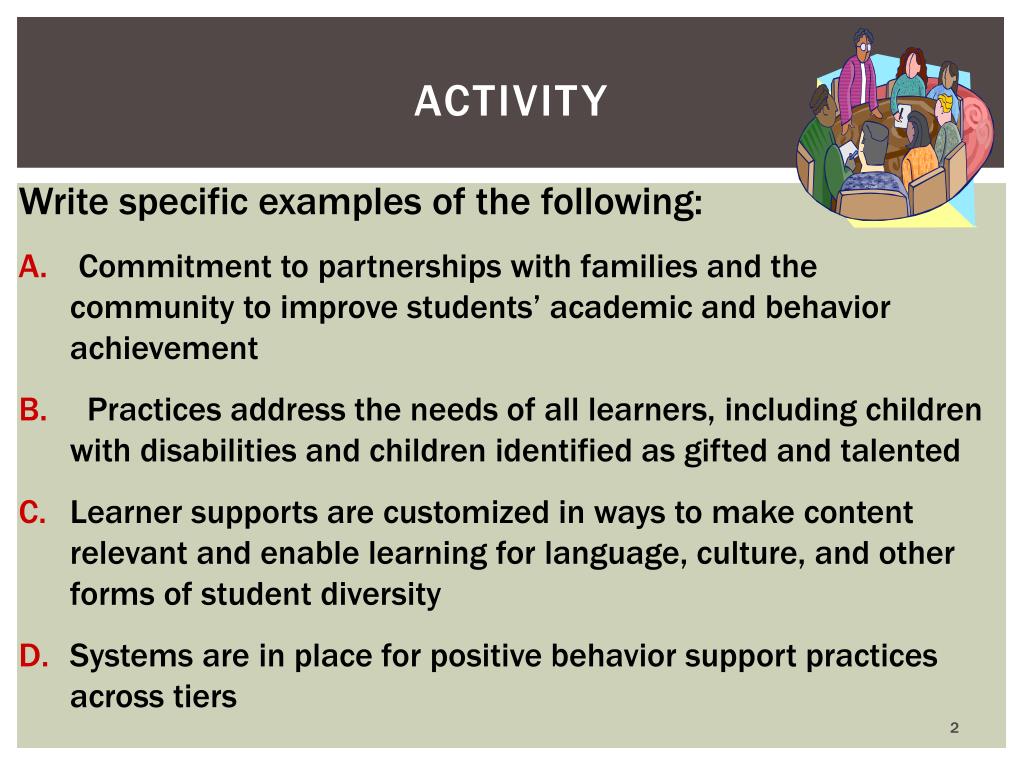 ACTIVITY Write specific examples of the following: Commitment to partnerships with families and the community to improve students’ academic and behavior achievement Practices address the needs of all learners, including children with disabilities and children identified as gifted and talented Learner supports are customized in ways to make content relevant and enable learning for language, culture, and other forms of student diversity Systems are in place for positive behavior support practices across tiers