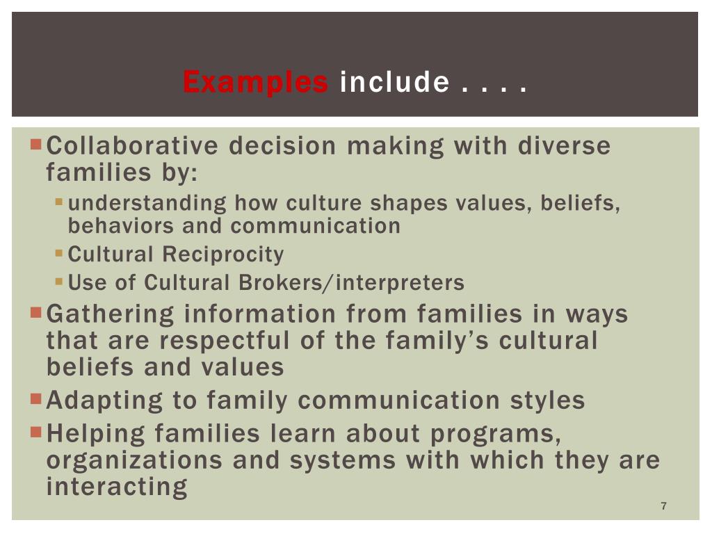 Examples include . . . . • Collaborative decision making with diverse families by: • understanding how culture shapes values, beliefs, behaviors and communication • Cultural Reciprocity • Use of Cultural Brokers/interpreters • Gathering information from families in ways that are respectful of the family’s cultural beliefs and values • Adapting to family communication styles • Helping families learn about programs, organizations and systems with which they are interacting