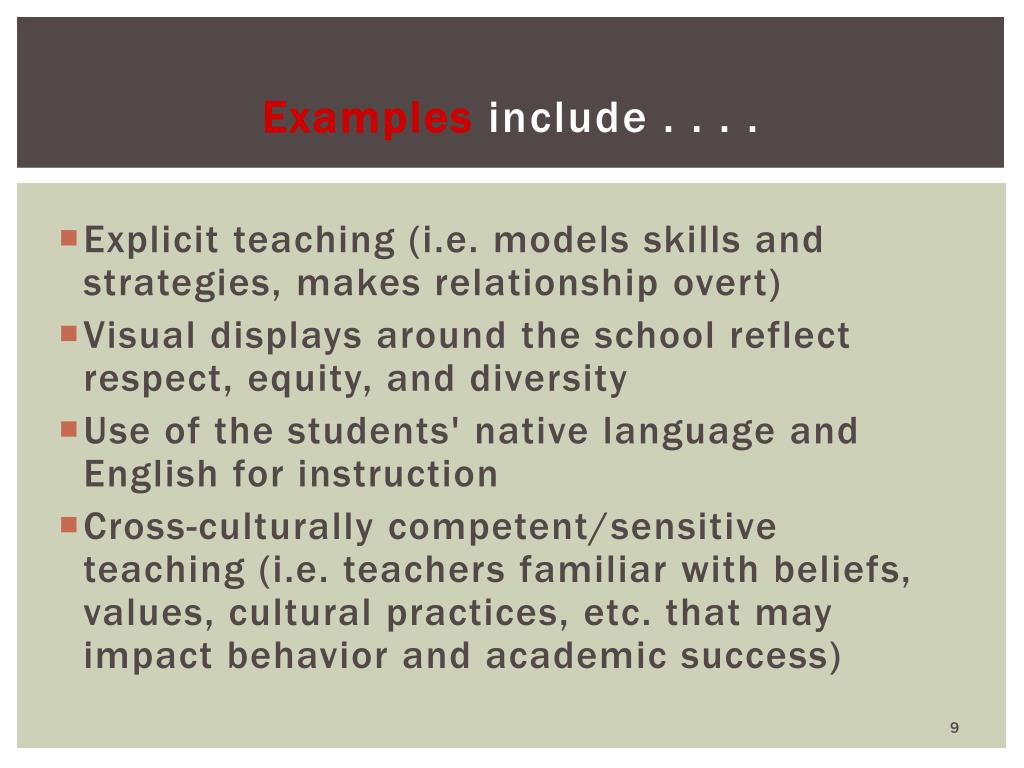 Examples include . . . . • Explicit teaching (i.e. models skills and strategies, makes relationship overt) • Visual displays around the school reflect respect, equity, and diversity • Use of the students' native language and English for instruction • Cross-culturally competent/sensitive teaching (i.e. teachers familiar with beliefs, values, cultural practices, etc. that may impact behavior and academic success)