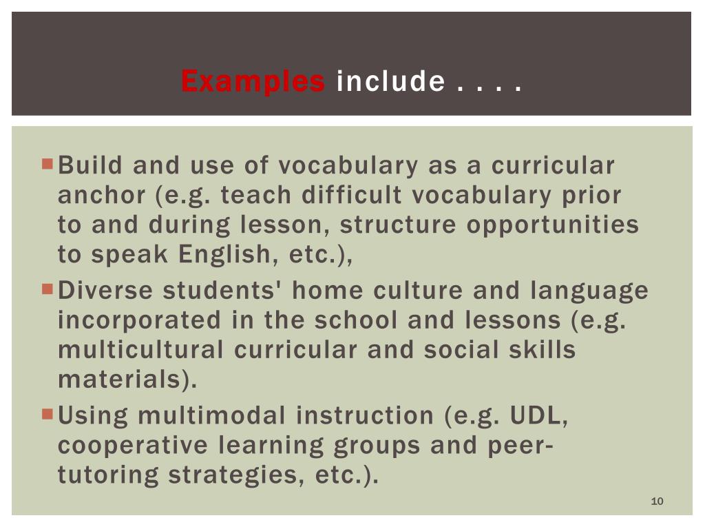Examples include . . . . • Build and use of vocabulary as a curricular anchor (e.g. teach difficult vocabulary prior to and during lesson, structure opportunities to speak English, etc.), • Diverse students' home culture and language incorporated in the school and lessons (e.g. multicultural curricular and social skills materials). • Using multimodal instruction (e.g. UDL, cooperative learning groups and peer-tutoring strategies, etc.).
