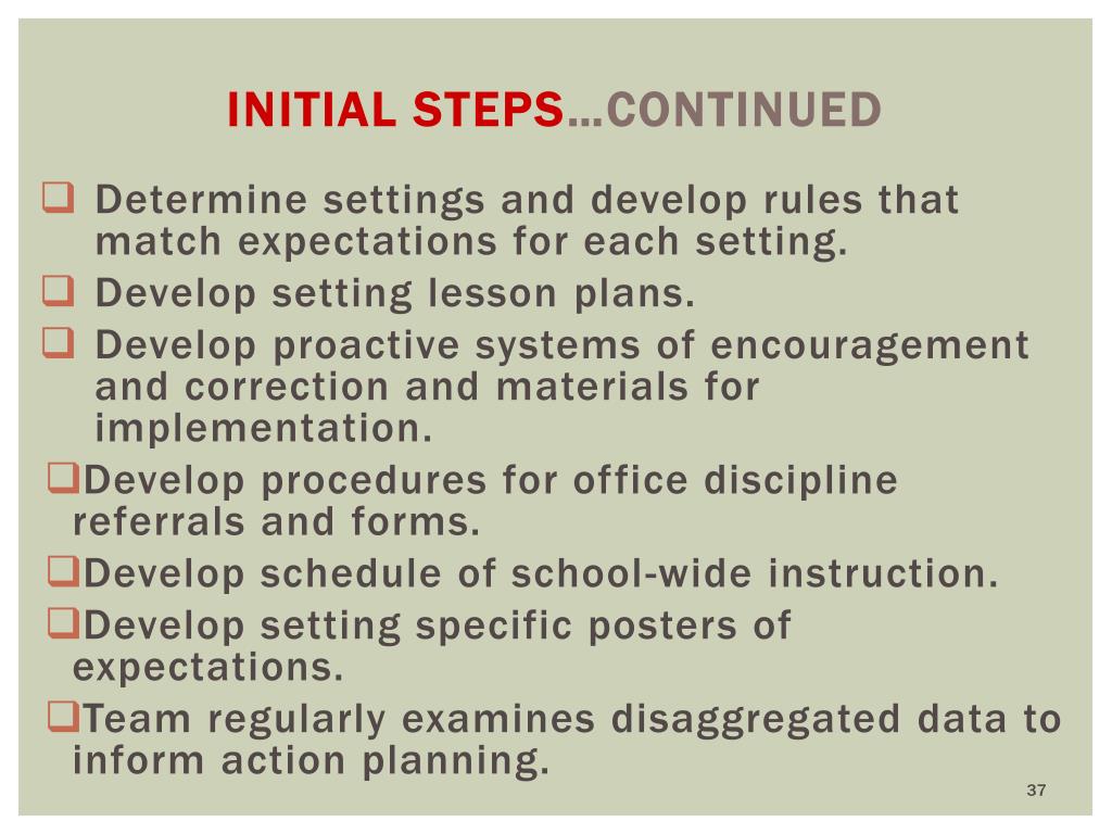 Initial Steps…continued Determine settings and develop rules that match expectations for each setting. Develop setting lesson plans. Develop proactive systems of encouragement and correction and materials for implementation. Develop procedures for office discipline referrals and forms. Develop schedule of school-wide instruction. Develop setting specific posters of expectations. Team regularly examines disaggregated data to inform action planning.