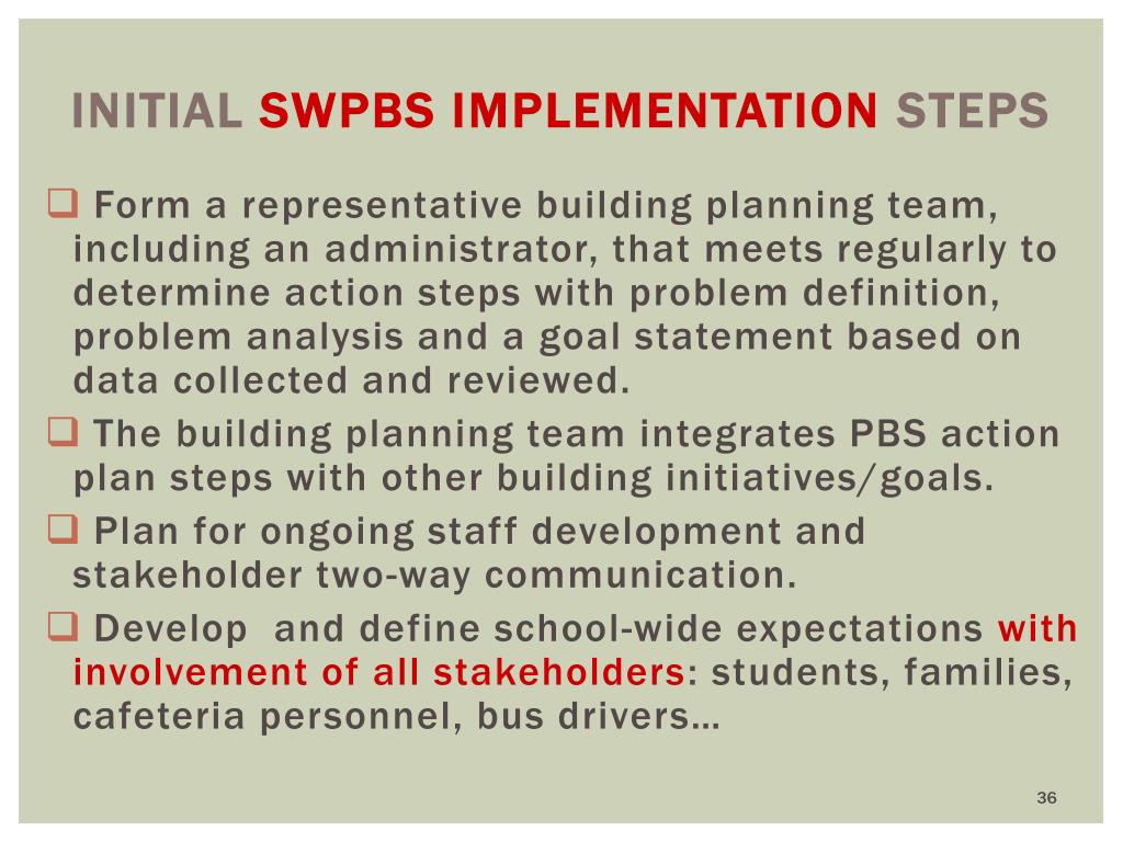 Initial SWPBS Implementation Steps Form a representative building planning team, including an administrator, that meets regularly to determine action steps with problem definition, problem analysis and a goal statement based on data collected and reviewed. The building planning team integrates PBS action plan steps with other building initiatives/goals. Plan for ongoing staff development and stakeholder two-way communication. Develop and define school-wide expectations with involvement of all stakeholders: students, families, cafeteria personnel, bus drivers…