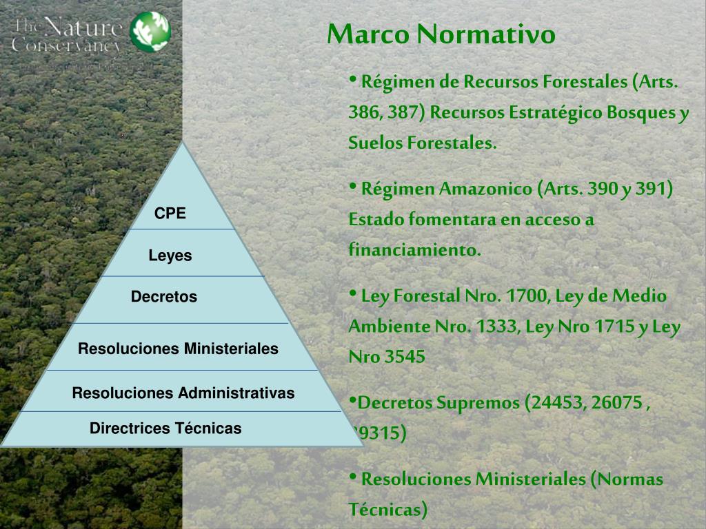 Marco Normativo • Régimen de Recursos Forestales (Arts. 386, 387) Recursos Estratégico Bosques y Suelos Forestales. • Régimen Amazonico (Arts. 390 y 391) Estado fomentara en acceso a financiamiento. • Ley Forestal Nro. 1700, Ley de Medio Ambiente Nro. 1333, Ley Nro 1715 y Ley Nro 3545 • Decretos Supremos (24453, 26075 , 29315) • Resoluciones Ministeriales (Normas Técnicas) • Resoluciones Administrativas (ABT) • Directrices e Instructivos CPE Leyes Decretos Resoluciones Ministeriales Resoluciones Administrativas Directrices Técnicas