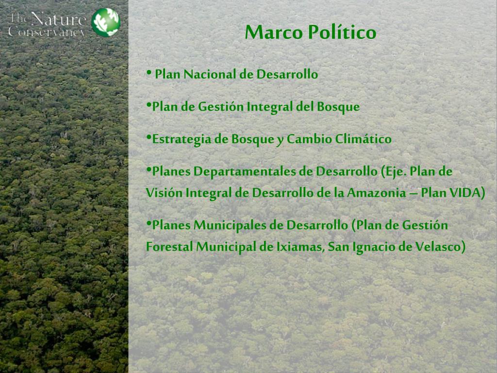 Marco Político • Plan Nacional de Desarrollo • Plan de Gestión Integral del Bosque • Estrategia de Bosque y Cambio Climático • Planes Departamentales de Desarrollo (Eje. Plan de Visión Integral de Desarrollo de la Amazonia – Plan VIDA) • Planes Municipales de Desarrollo (Plan de Gestión Forestal Municipal de Ixiamas, San Ignacio de Velasco)