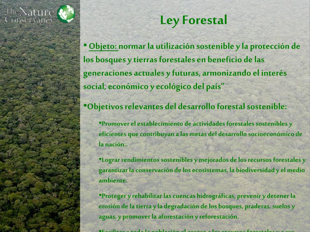 Ley Forestal • Objeto: normar la utilización sostenible y la protección de los bosques y tierras forestales en beneficio de las generaciones actuales y futuras, armonizando el interés social, económico y ecológico del país” • Objetivos relevantes del desarrollo forestal sostenible: • Promover el establecimiento de actividades forestales sostenibles y eficientes que contribuyan a las metas del desarrollo socioeconómico de la nación.. • Lograr rendimientos sostenibles y mejorados de los recursos forestales y garantizar la conservación de los ecosistemas, la biodiversidad y el medio ambiente. • Proteger y rehabilitar las cuencas hidrográficas, prevenir y detener la erosión de la tierra y la degradación de los bosques, praderas, suelos y aguas, y promover la aforestación y reforestación. • Facilitar a toda la población el acceso a los recursos forestales y a sus beneficios, en estricto cumplimiento de las prescripciones de protección y sostenibilidad.