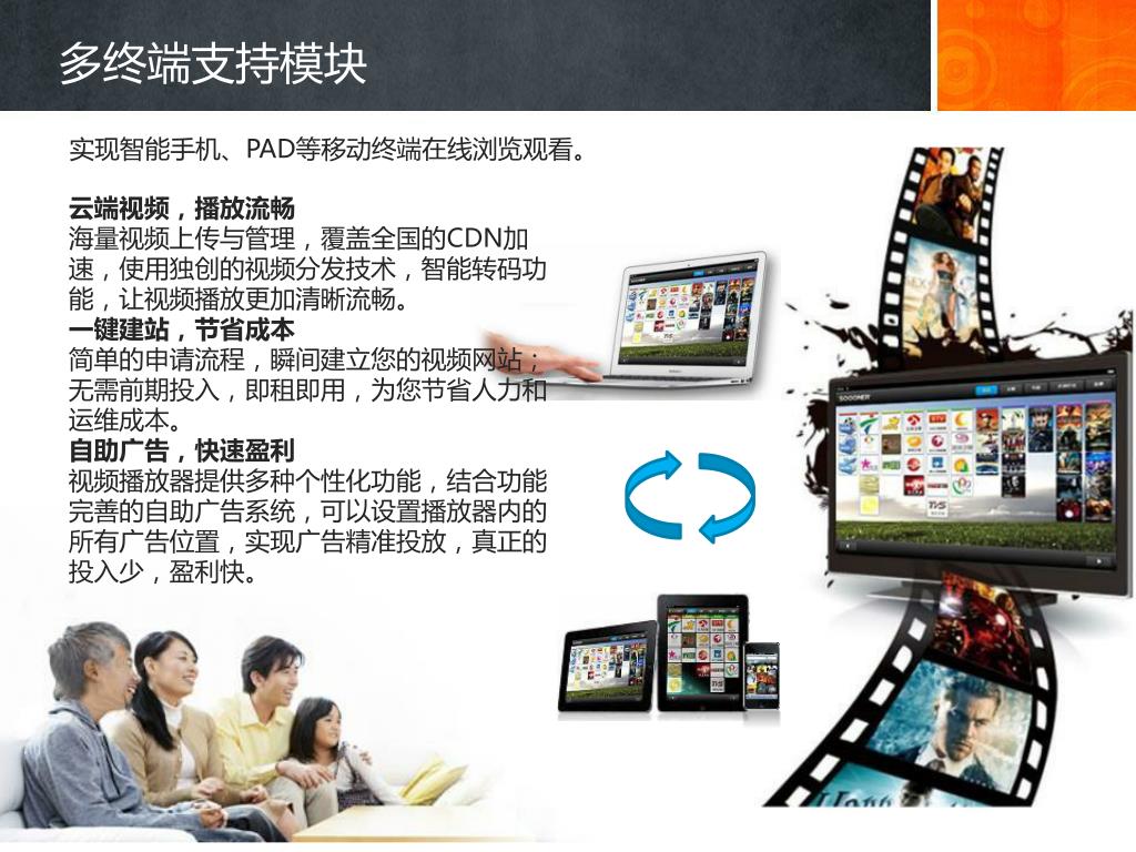 多终端支持模块 实现智能手机、PAD等移动终端在线浏览观看。 云端视频,播放流畅海量视频上传与管理,覆盖全国的CDN加速,使用独创的视频分发技术,智能转码功能,让视频播放更加清晰流畅。 一键建站,节省成本简单的申请流程,瞬间建立您的视频网站;无需前期投入,即租即用,为您节省人力和运维成本。 自助广告,快速盈利视频播放器提供多种个性化功能,结合功能完善的自助广告系统,可以设置播放器内的所有广告位置,实现广告精准投放,真正的投入少,盈利快。