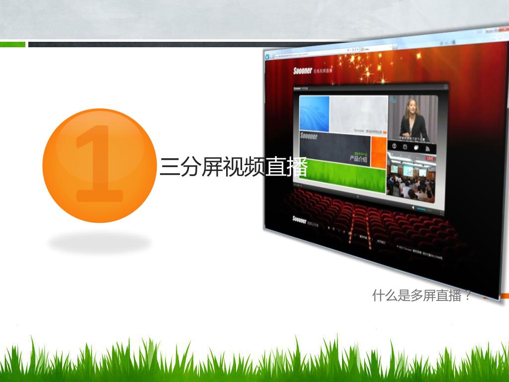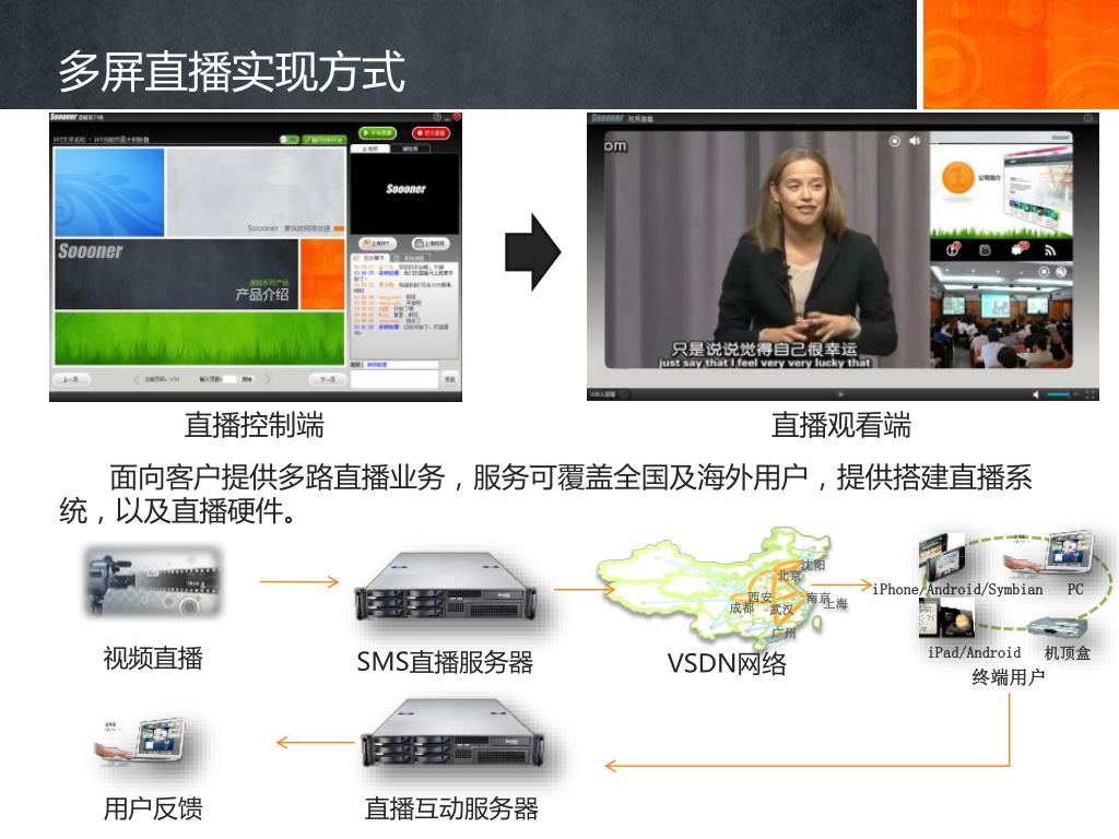Soooner 更 快的网络加速. Soooner 系列产品 产品介绍. 北京赛维安讯科技发展有限公司. 三 分 屏视频直播 OVP 云视频平台 教育类产品 企业定制机顶盒. 1. 三分屏视频 直播. 什么是多屏直播?. 多屏直播目的. 三屏联动多屏直播平台. 视频展现. 白板手势同步还原. PPT 同步演示,支持下载. 将 讲演 内容完整的迁移到远程在线多屏系统中,实现多方位展现功能。 培训、教学、会议直播; 互动留言,问题提问; VSDN 网络加速支持大量用户同时在线; 支持两路视频同时直播;. 多屏直播实现方式.
