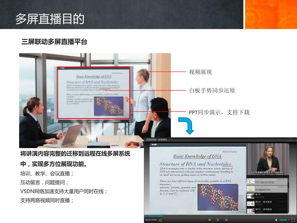 多屏直播目的 三屏联动多屏直播平台 视频展现 白板手势同步还原 PPT同步演示,支持下载 将讲演内容完整的迁移到远程在线多屏系统中,实现多方位展现功能。 培训、教学、会议直播; 互动留言,问题提问; VSDN网络加速支持大量用户同时在线; 支持两路视频同时直播;