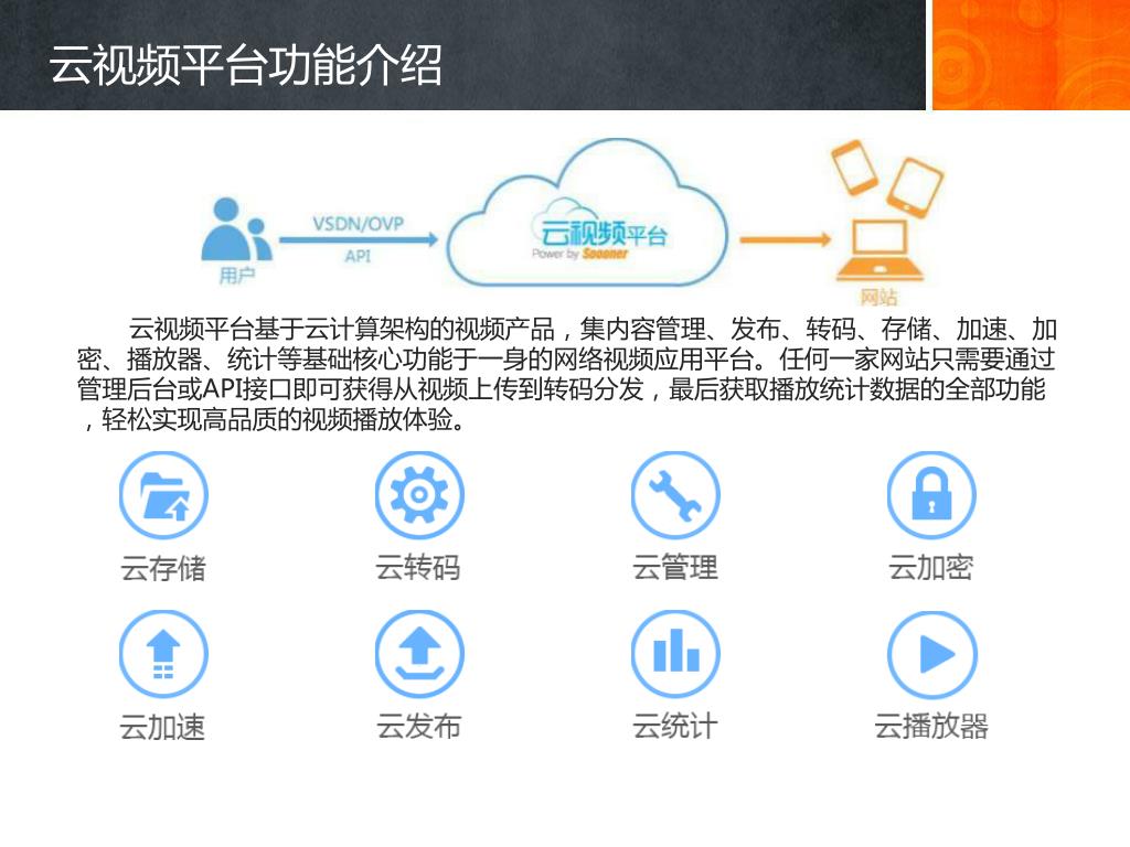 云视频平台功能介绍 云视频平台基于云计算架构的视频产品,集内容管理、发布、转码、存储、加速、加密、播放器、统计等基础核心功能于一身的网络视频应用平台。任何一家网站只需要通过管理后台或API接口即可获得从视频上传到转码分发,最后获取播放统计数据的全部功能,轻松实现高品质的视频播放体验。