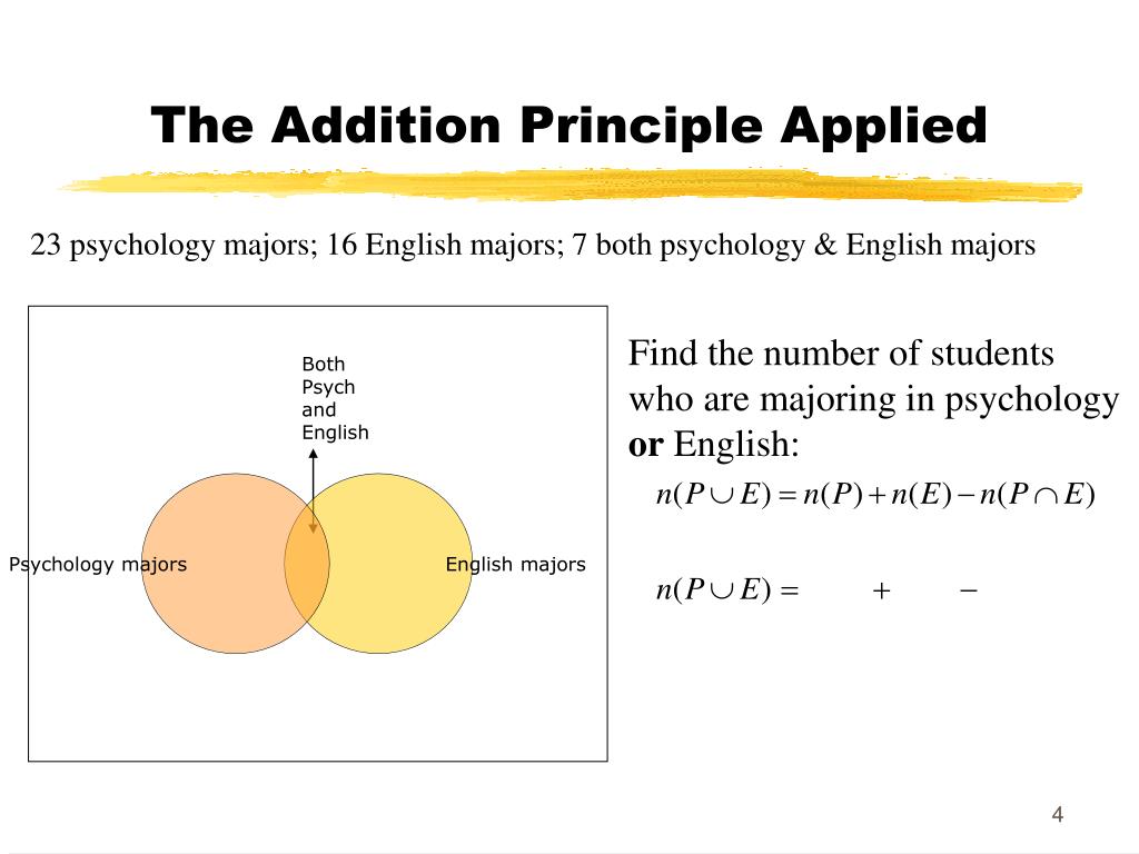 Both Psych and English The Addition Principle Applied 23 psychology majors; 16 English majors; 7 both psychology & English majors Find the number of students who are majoring in psychology or English: