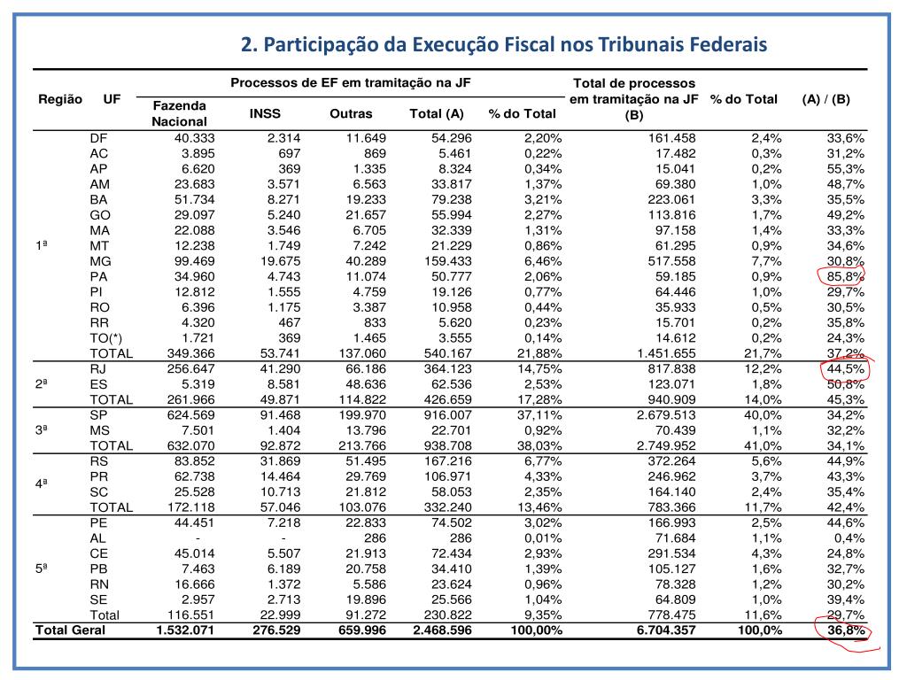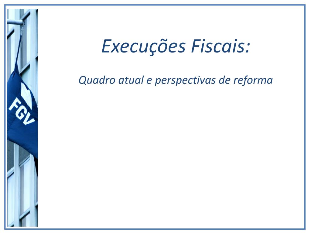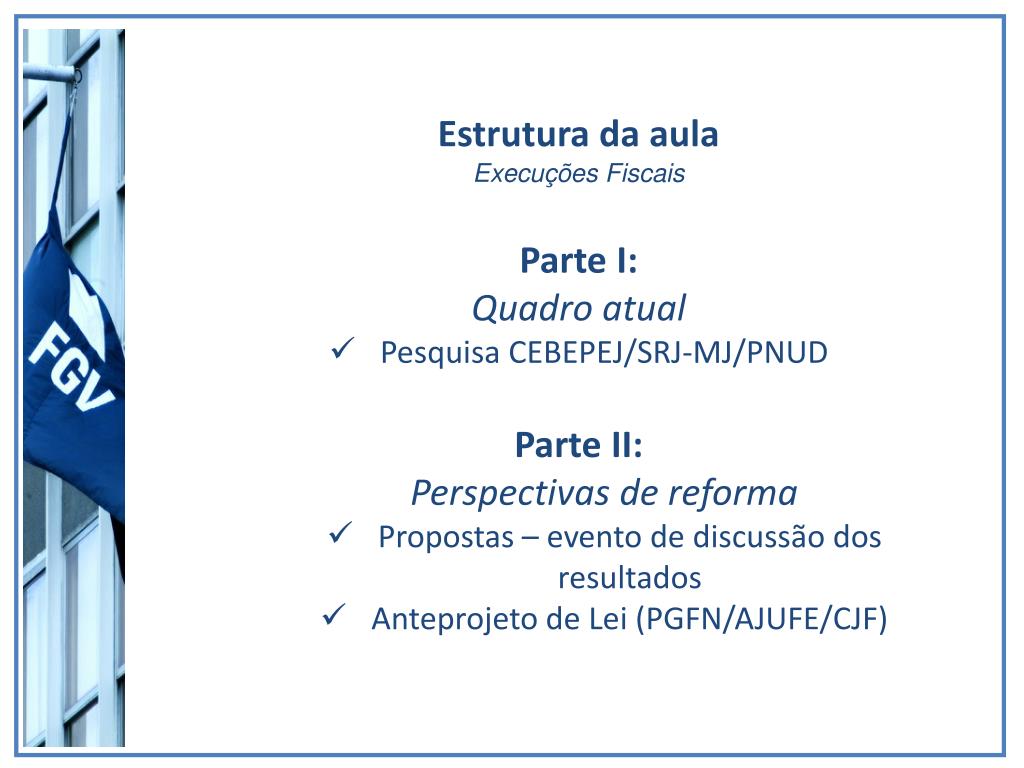 Estrutura da aula • Execuções Fiscais • Parte I: • Quadro atual • Pesquisa CEBEPEJ/SRJ-MJ/PNUD Parte II: • Perspectivas de reforma • Propostas – evento de discussão dos resultados • Anteprojeto de Lei (PGFN/AJUFE/CJF)