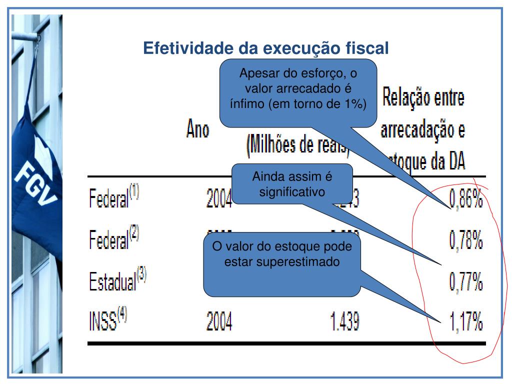 Efetividade da execução fiscal Apesar do esforço, o valor arrecadado é ínfimo (em torno de 1%) Ainda assim é significativo O valor do estoque pode estar superestimado