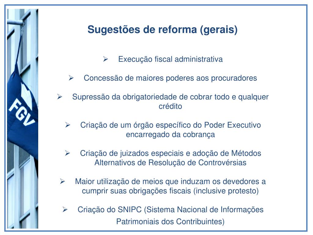 Sugestões de reforma (gerais) • Execução fiscal administrativa • Concessão de maiores poderes aos procuradores • Supressão da obrigatoriedade de cobrar todo e qualquer crédito • Criação de um órgão específico do Poder Executivo encarregado da cobrança • Criação de juizados especiais e adoção de Métodos Alternativos de Resolução de Controvérsias • Maior utilização de meios que induzam os devedores a cumprir suas obrigações fiscais (inclusive protesto) • Criação do SNIPC (Sistema Nacional de Informações Patrimoniais dos Contribuintes)