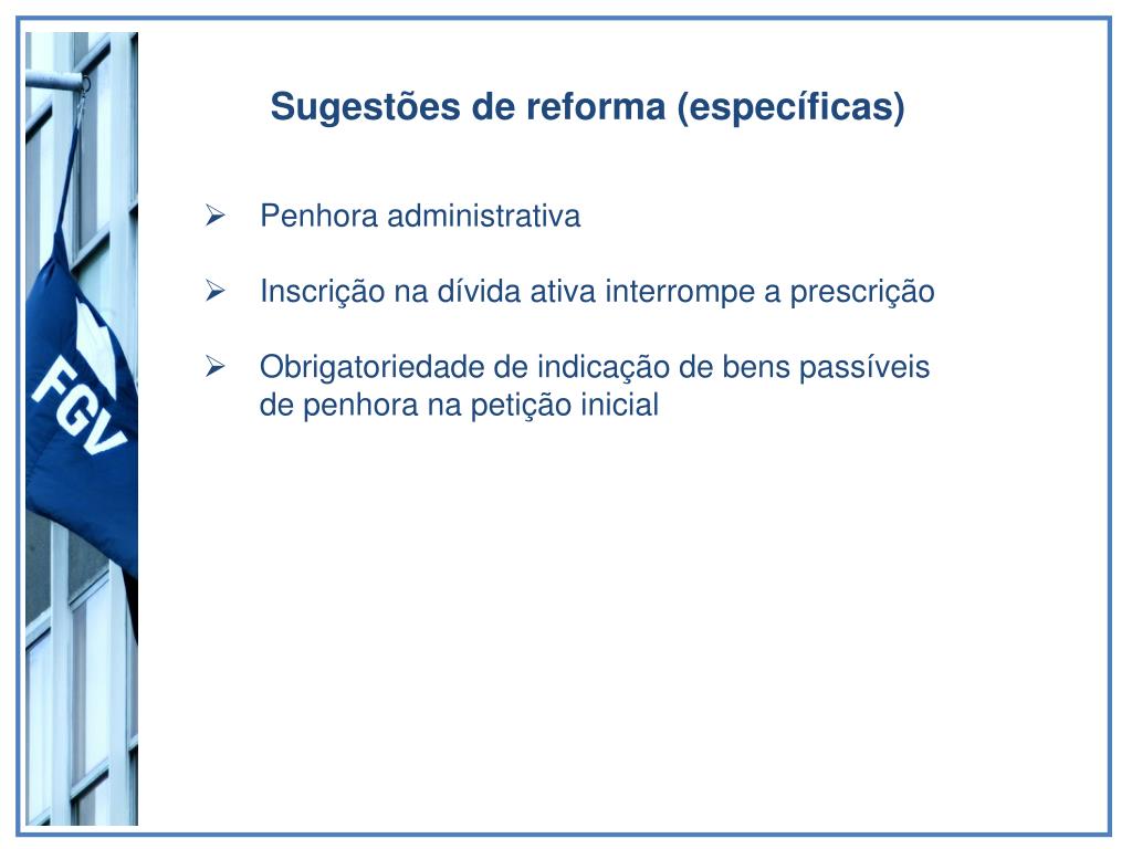Sugestões de reforma (específicas) • Penhora administrativa • Inscrição na dívida ativa interrompe a prescrição • Obrigatoriedade de indicação de bens passíveis de penhora na petição inicial