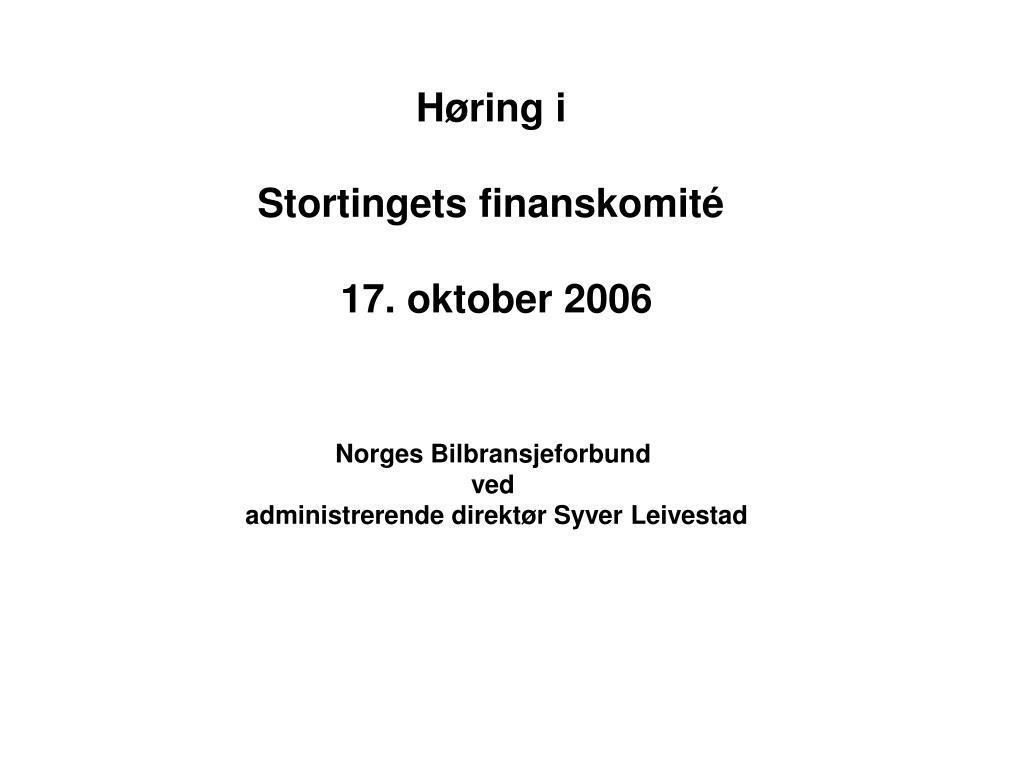 Høring i Stortingets finanskomité 17. oktober 2006. Norges Bilbransjeforbund ved administrerende direktør Syver Leivestad. Norges Bilbransjeforbund.