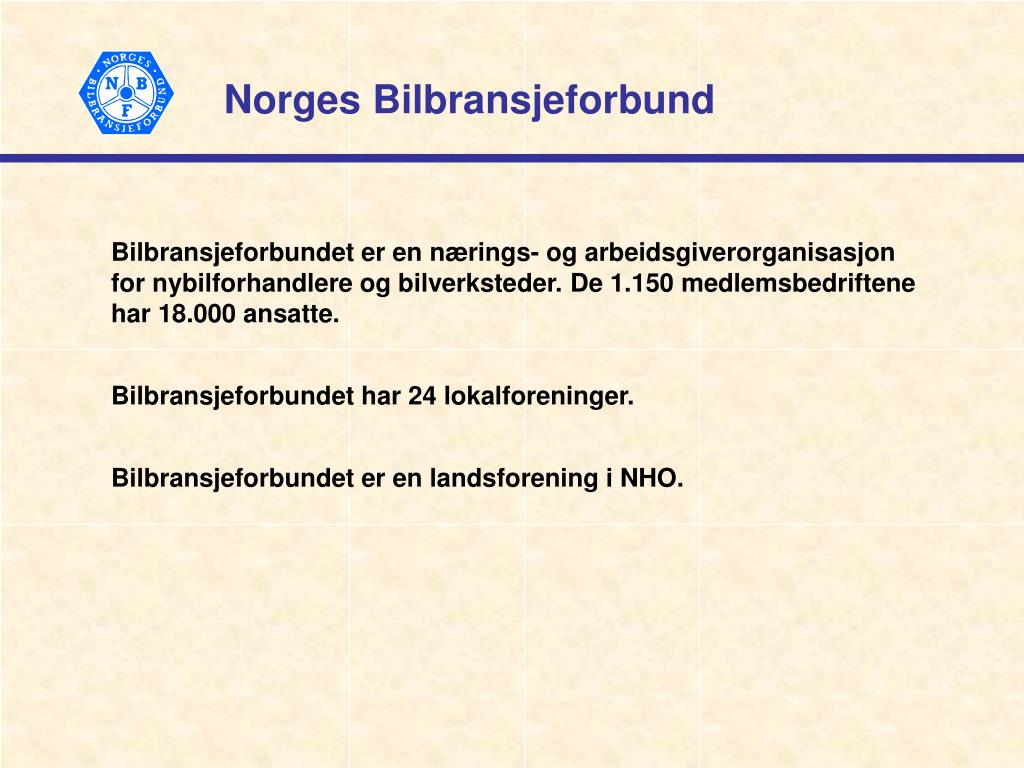 Norges Bilbransjeforbund Bilbransjeforbundet er en nærings- og arbeidsgiverorganisasjon for nybilforhandlere og bilverksteder. De 1.150 medlemsbedriftene har 18.000 ansatte. Bilbransjeforbundet har 24 lokalforeninger. Bilbransjeforbundet er en landsforening i NHO.