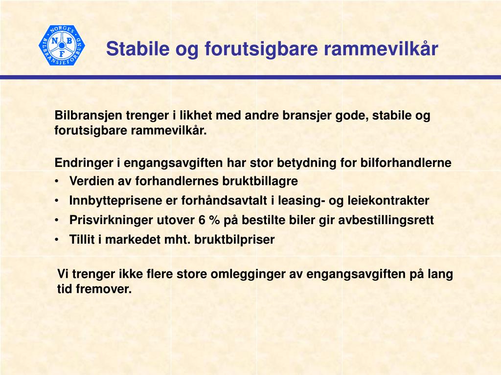 Endringer i engangsavgiften har stor betydning for bilforhandlerne • Verdien av forhandlernes bruktbillagre • Innbytteprisene er forhåndsavtalt i leasing- og leiekontrakter • Prisvirkninger utover 6 % på bestilte biler gir avbestillingsrett • Tillit i markedet mht. bruktbilpriser Stabile og forutsigbare rammevilkår Bilbransjen trenger i likhet med andre bransjer gode, stabile og forutsigbare rammevilkår. Vi trenger ikke flere store omlegginger av engangsavgiften på lang tid fremover.