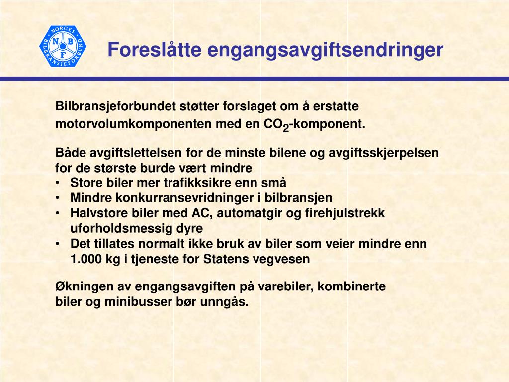 Både avgiftslettelsen for de minste bilene og avgiftsskjerpelsen for de største burde vært mindre • Store biler mer trafikksikre enn små • Mindre konkurransevridninger i bilbransjen • Halvstore biler med AC, automatgir og firehjulstrekk uforholdsmessig dyre • Det tillates normalt ikke bruk av biler som veier mindre enn 1.000 kg i tjeneste for Statens vegvesen Foreslåtte engangsavgiftsendringer Bilbransjeforbundet støtter forslaget om å erstatte motorvolumkomponenten med en CO2-komponent. Økningen av engangsavgiften på varebiler, kombinerte biler og minibusser bør unngås.
