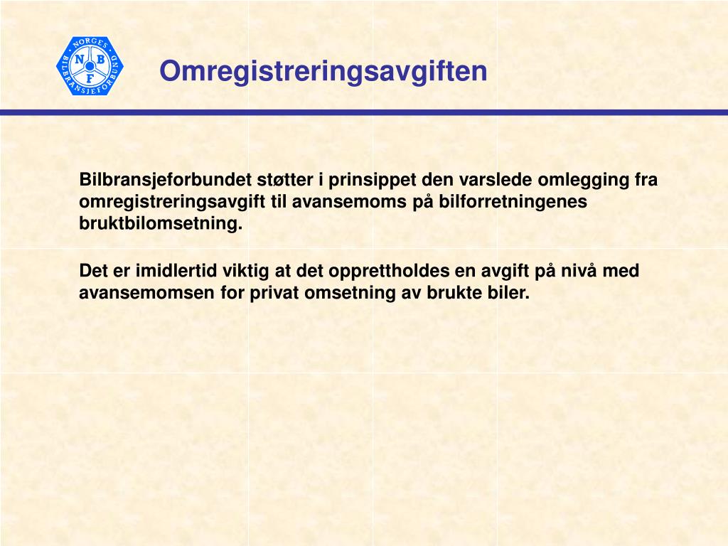 Omregistreringsavgiften Bilbransjeforbundet støtter i prinsippet den varslede omlegging fra omregistreringsavgift til avansemoms på bilforretningenes bruktbilomsetning. Det er imidlertid viktig at det opprettholdes en avgift på nivå med avansemomsen for privat omsetning av brukte biler.