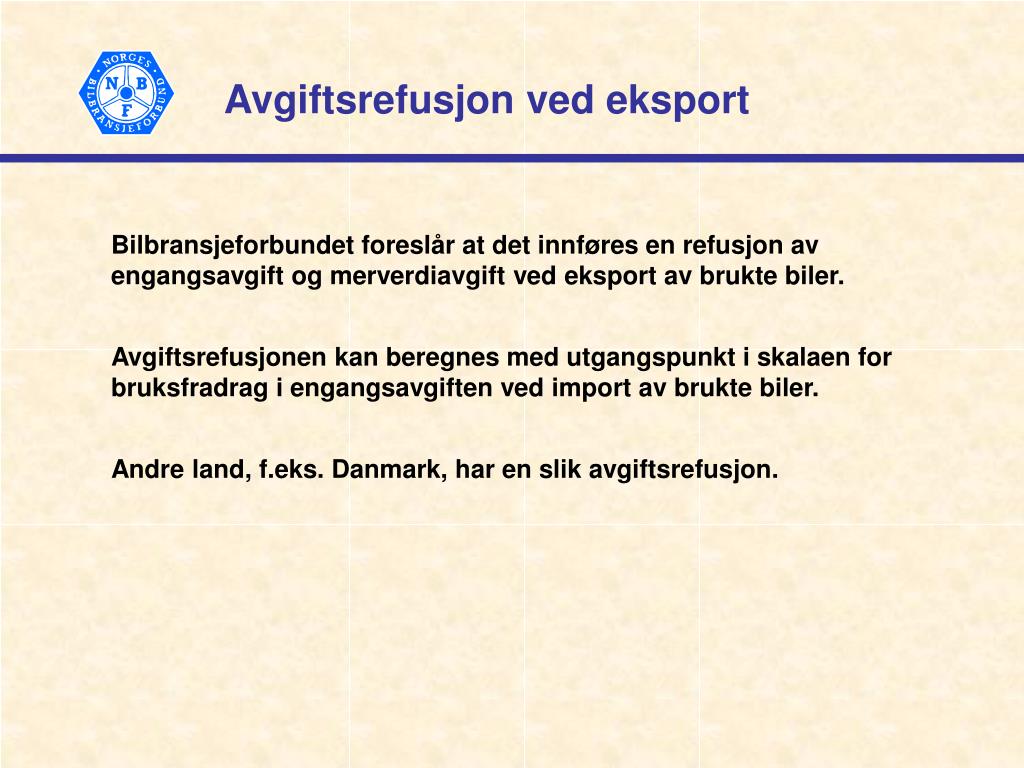 Avgiftsrefusjon ved eksport Bilbransjeforbundet foreslår at det innføres en refusjon av engangsavgift og merverdiavgift ved eksport av brukte biler. Avgiftsrefusjonen kan beregnes med utgangspunkt i skalaen for bruksfradrag i engangsavgiften ved import av brukte biler. Andre land, f.eks. Danmark, har en slik avgiftsrefusjon.