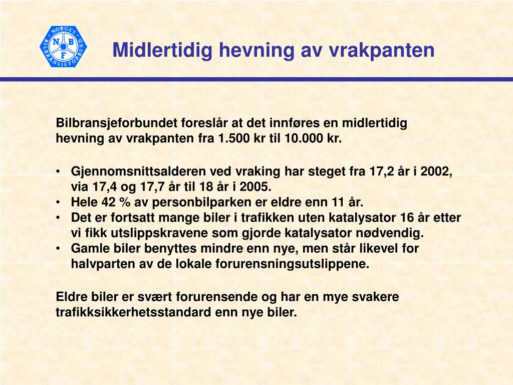 Midlertidig hevning av vrakpanten Bilbransjeforbundet foreslår at det innføres en midlertidig hevning av vrakpanten fra 1.500 kr til 10.000 kr. • Gjennomsnittsalderen ved vraking har steget fra 17,2 år i 2002, via 17,4 og 17,7 år til 18 år i 2005. • Hele 42 % av personbilparken er eldre enn 11 år. • Det er fortsatt mange biler i trafikken uten katalysator 16 år etter vi fikk utslippskravene som gjorde katalysator nødvendig. • Gamle biler benyttes mindre enn nye, men står likevel for halvparten av de lokale forurensningsutslippene. Eldre biler er svært forurensende og har en mye svakere trafikksikkerhetsstandard enn nye biler.