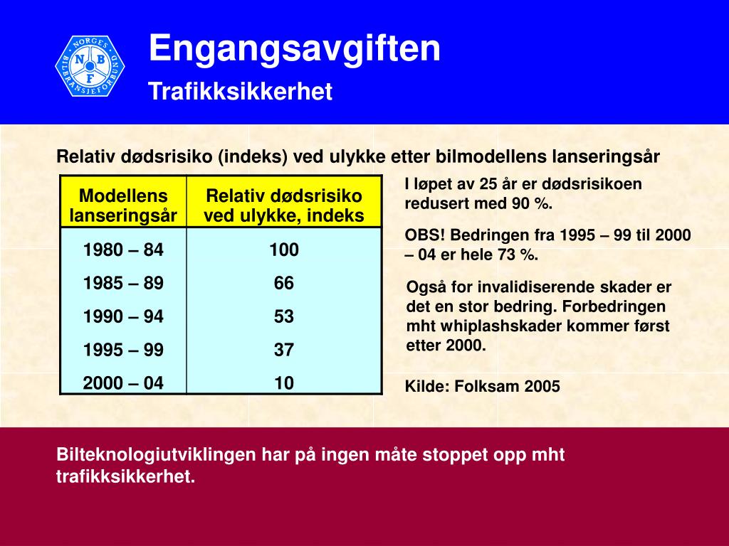 Engangsavgiften Trafikksikkerhet Relativ dødsrisiko (indeks) ved ulykke etter bilmodellens lanseringsår I løpet av 25 år er dødsrisikoen redusert med 90 %. OBS! Bedringen fra 1995 – 99 til 2000 – 04 er hele 73 %. Også for invalidiserende skader er det en stor bedring. Forbedringen mht whiplashskader kommer først etter 2000. Kilde: Folksam 2005 Bilteknologiutviklingen har på ingen måte stoppet opp mht trafikksikkerhet.