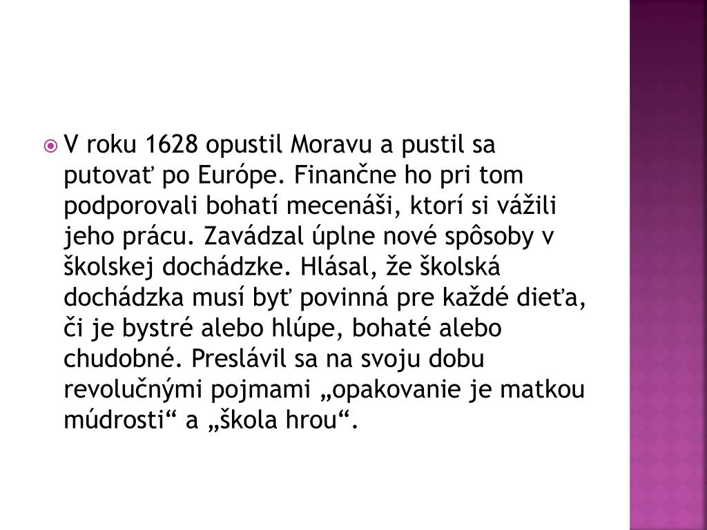 Ján Amos Komenský. * 28. marec 1592, Nivnice , Česko † 15. november 1670 , Amsterdam, Holandsko Bol pedagóg , jazykovedec, prírodovedec, humanista, filozof, politik. Mal slovenských predkov . Jeho priezvisko je pravdepodobne odvodené od obce Komňa v okrese Uherské Hradiště.