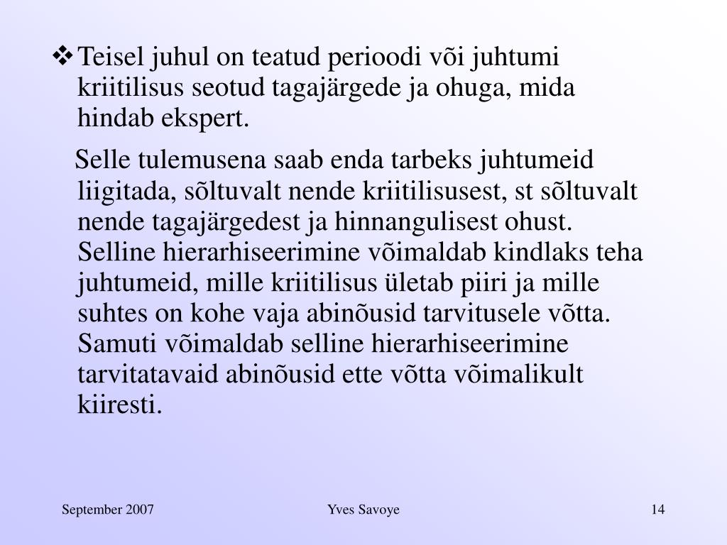 Mis on kardetavad juhtumid? • mõne allsüsteemi mittevastavus ettenähtud nõuetele Kardetavaid juhtumeid on kokkuvõtvalt kahte tüüpi: • inimeste elu ja tervise ohtu seadmine või keskkonna ohustamine, ilma et see tuleneks mõne allsüsteemi veast Yves Savoye