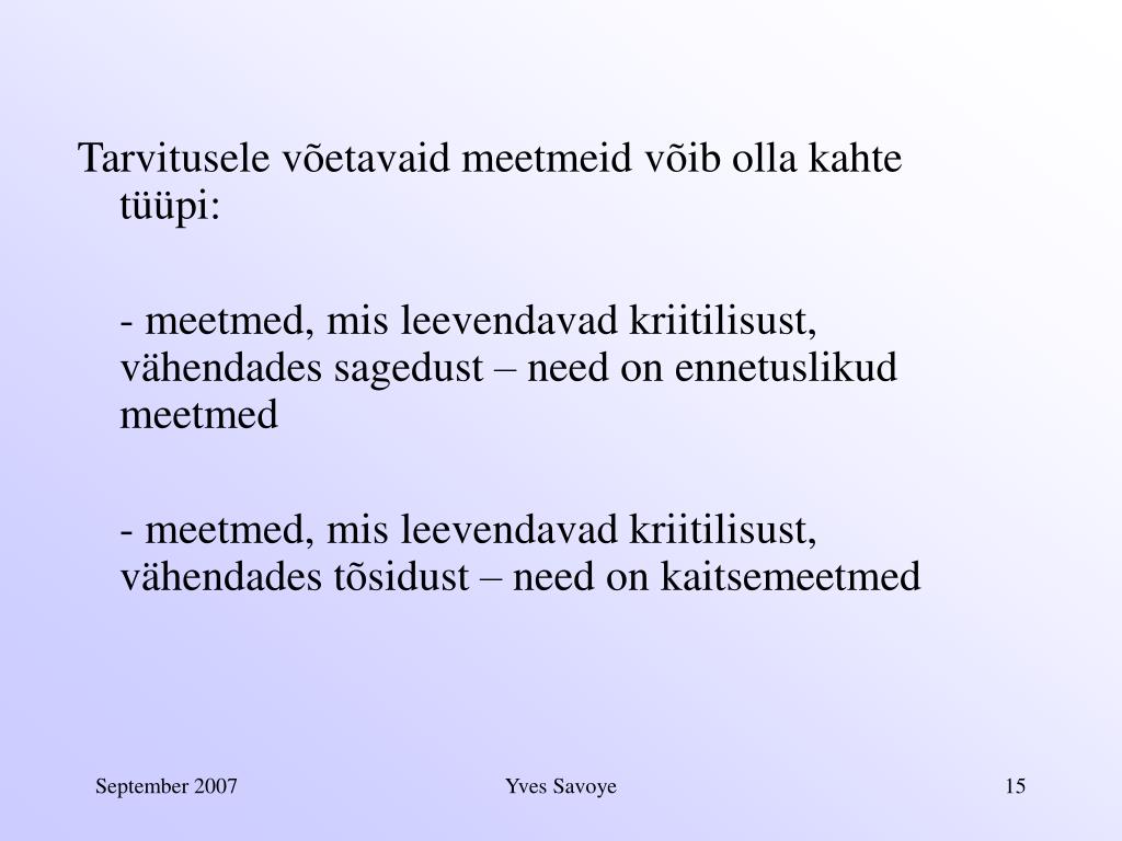 Ohu hindamisel arvesse võetavad parameetrid Oht, mis tuleneb kardetavatest juhtumitest, sõltub kahest parameetrist: • Sagedus • Tõsidus Yves Savoye