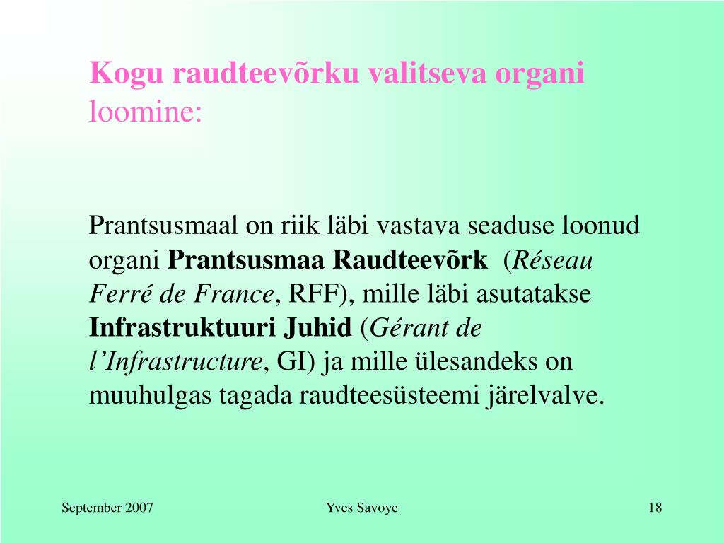 Kogu raudteevõrku valitseva organi loomine: Prantsusmaal on riik läbi vastava seaduse loonud organi Prantsusmaa Raudteevõrk(Réseau Ferré de France, RFF), mille läbi asutatakse Infrastruktuuri Juhid(Gérant de l’Infrastructure, GI) ja mille ülesandeks on muuhulgas tagada raudteesüsteemi järelvalve. Yves Savoye