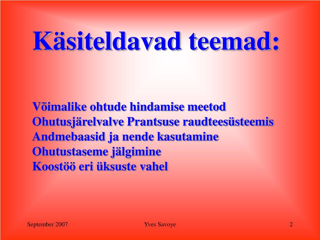 Käsiteldavad teemad:Võimalike ohtude hindamise meetodOhutusjärelvalve Prantsuse raudteesüsteemisAndmebaasid ja nende kasutamineOhutustaseme jälgimineKoostöö eri üksuste vahel Yves Savoye