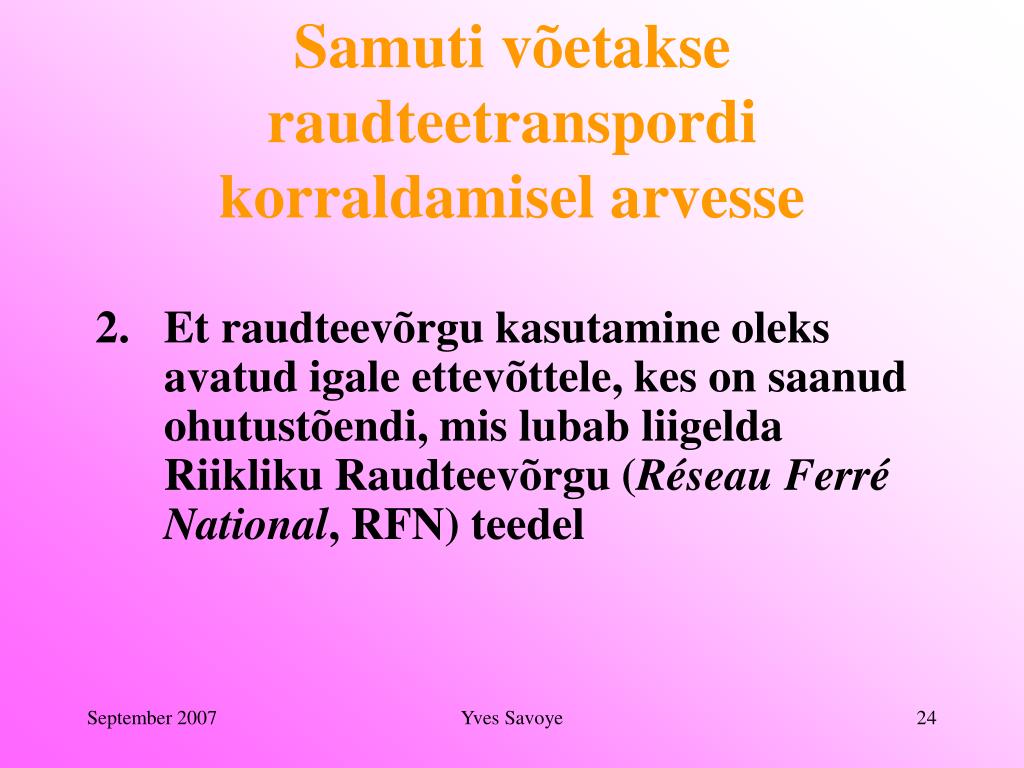 Samuti võetakse raudteetranspordi korraldamisel arvesse • Et raudteevõrgu kasutamine oleks avatud igale ettevõttele, kes on saanud ohutustõendi, mis lubab liigelda Riikliku Raudteevõrgu (Réseau Ferré National, RFN) teedel Yves Savoye