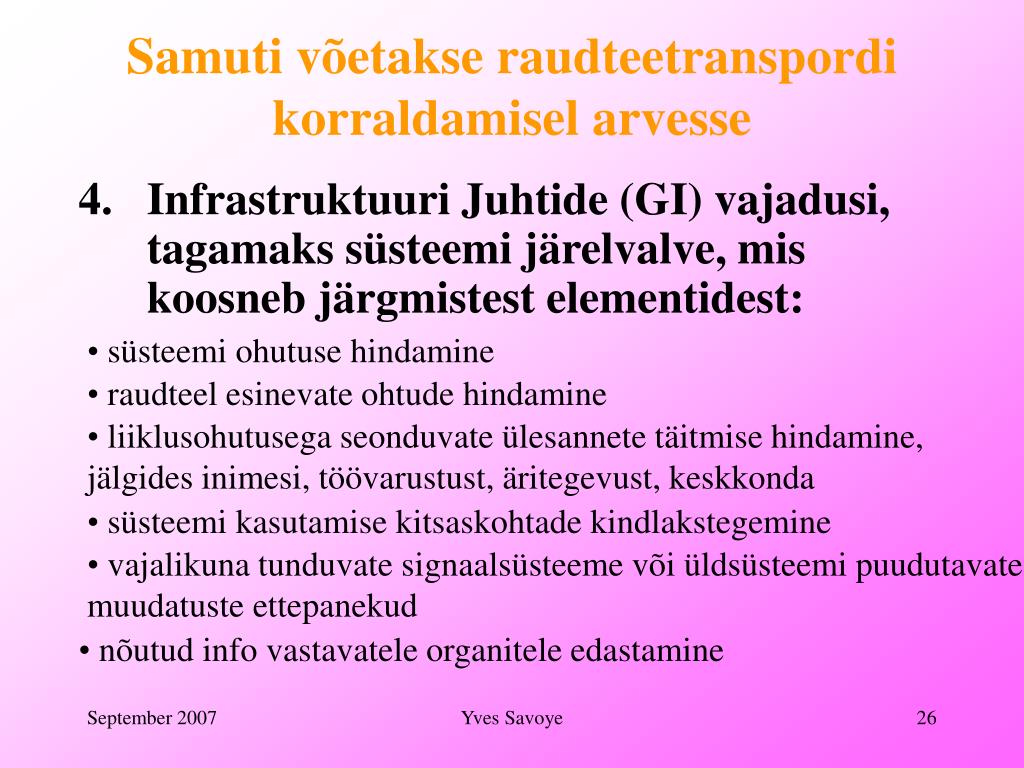 Samuti võetakse raudteetranspordi korraldamisel arvesse • Infrastruktuuri Juhtide (GI) vajadusi, tagamaks süsteemi järelvalve, mis koosneb järgmistest elementidest: • süsteemi ohutuse hindamine • raudteel esinevate ohtude hindamine • liiklusohutusega seonduvate ülesannete täitmise hindamine, • jälgides inimesi, töövarustust, äritegevust, keskkonda • süsteemi kasutamise kitsaskohtade kindlakstegemine • vajalikuna tunduvate signaalsüsteeme või üldsüsteemi puudutavate • muudatuste ettepanekud • nõutud info vastavatele organitele edastamine Yves Savoye