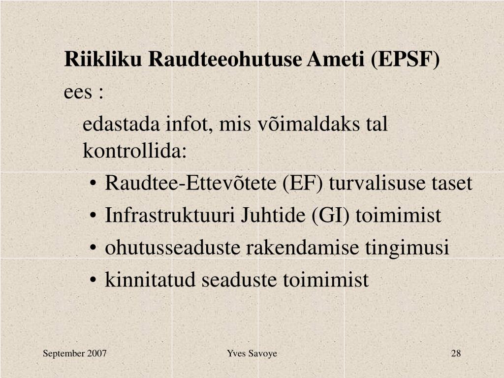 Riikliku Raudteeohutuse Ameti (EPSF) ülesanded: väljastada, tagasi võttavõiedasi lükata : • raudtee-ettevõtete ohutustõendeid • Infrastruktuuri Juhtide nõusolekuid • asutuste või kvalifitseeritud ekspertide nõusolekuid • raudteetranspordisüsteemide ja allsüsteemide ehitus-, • ümbertegemis- ja kaubandusliku kasutamise lube või • kasutamispiiranguid Yves Savoye