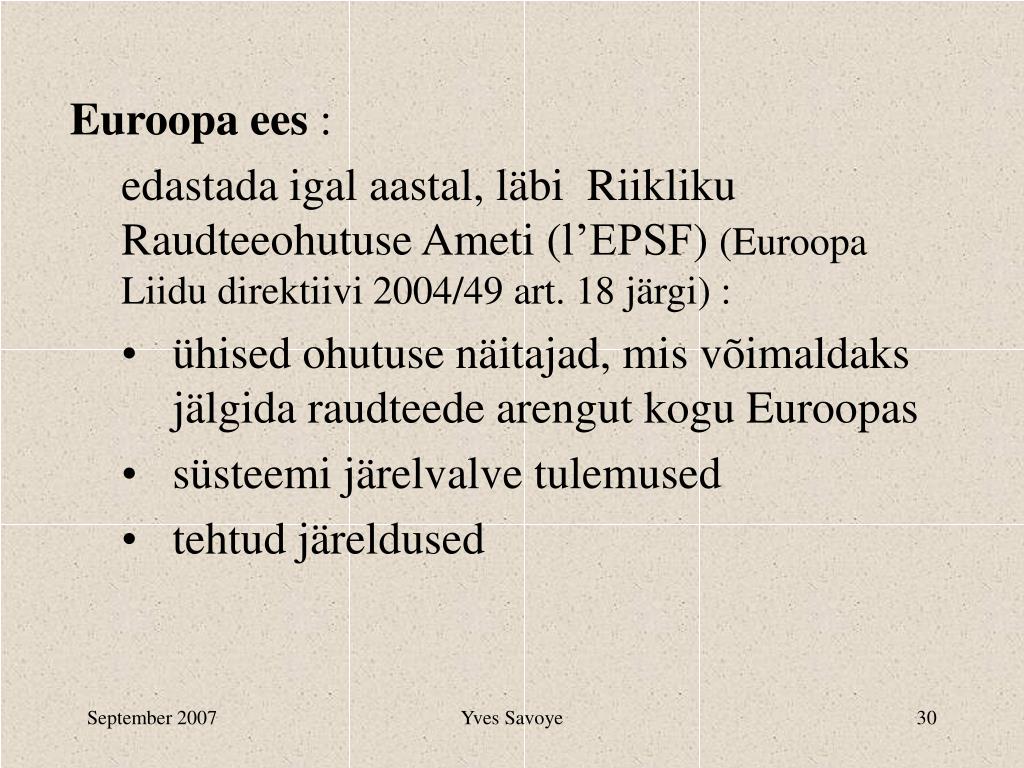 Euroopa ees : • edastada igal aastal, läbi Riikliku Raudteeohutuse Ameti (l’EPSF)(Euroopa Liidu direktiivi 2004/49 art. 18 järgi) : • ühised ohutuse näitajad, mis võimaldaks jälgida raudteede arengut kogu Euroopas • süsteemi järelvalve tulemused • tehtud järeldused Yves Savoye