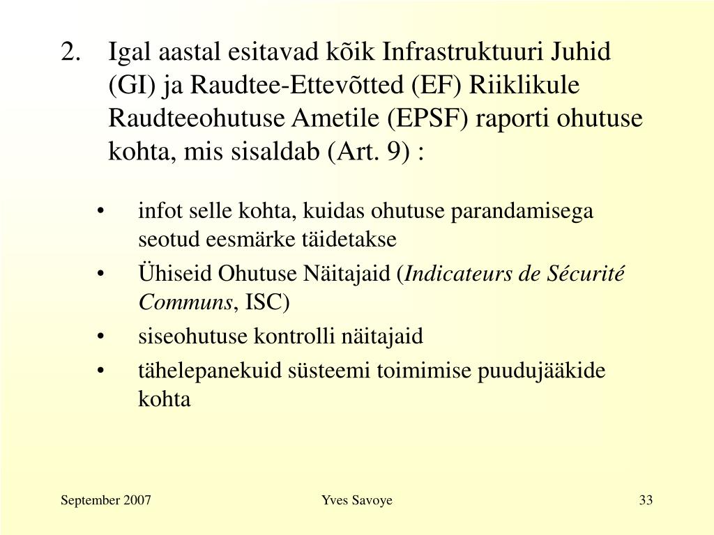 Igal aastal esitavad kõik Infrastruktuuri Juhid(GI)ja Raudtee-Ettevõtted(EF)Riiklikule Raudteeohutuse Ametile (EPSF) raporti ohutuse kohta, mis sisaldab (Art. 9) : • infot selle kohta, kuidas ohutuse parandamisega seotud eesmärke täidetakse • Ühiseid Ohutuse Näitajaid (Indicateurs de SécuritéCommuns, ISC) • siseohutuse kontrolli näitajaid • tähelepanekuid süsteemi toimimise puudujääkide kohta Yves Savoye