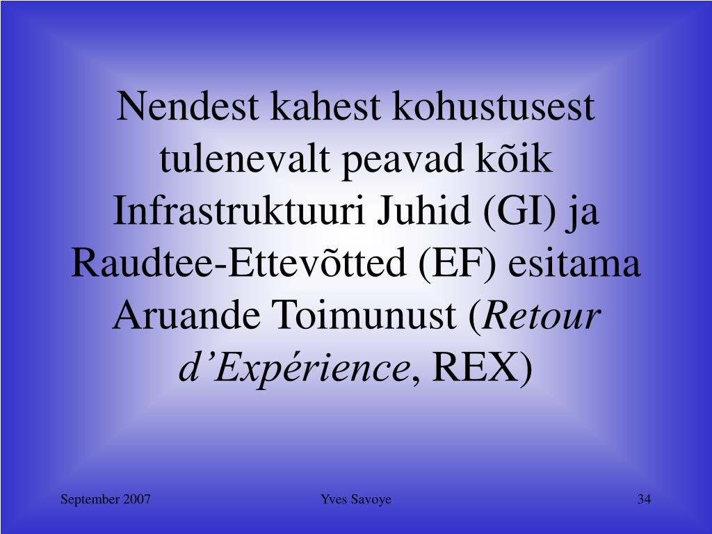 Nendest kahest kohustusest tulenevalt peavad kõik Infrastruktuuri Juhid (GI) ja Raudtee-Ettevõtted (EF)esitamaAruande Toimunust(Retour d’Expérience, REX) Yves Savoye