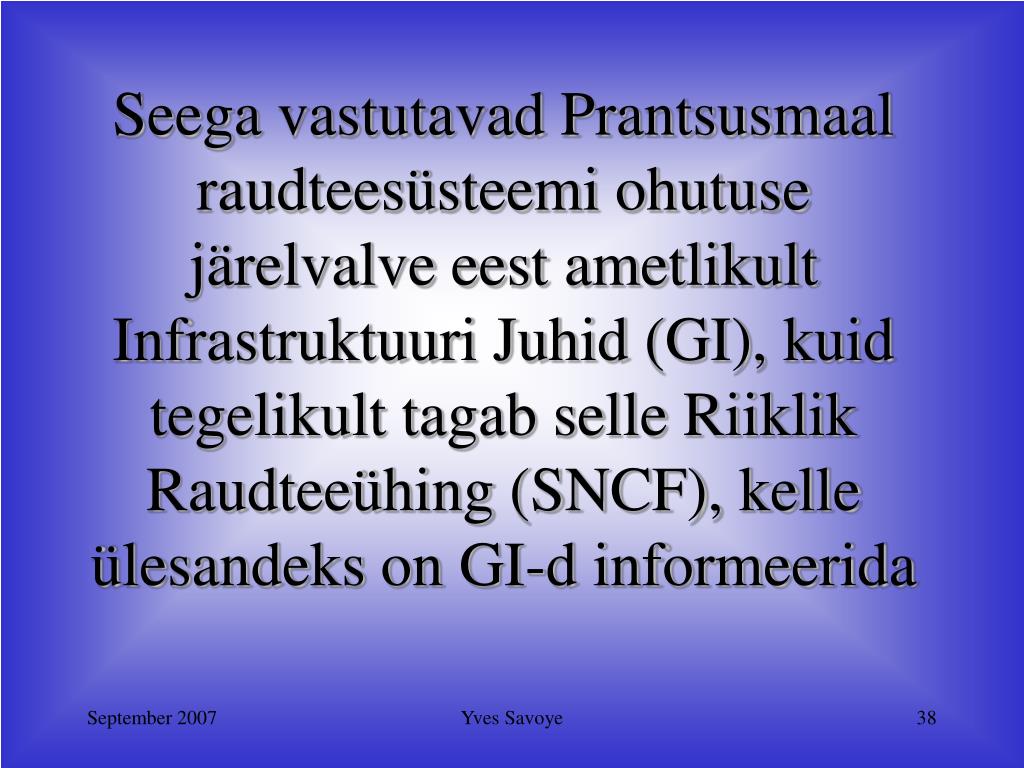 KOHUSTUSEDEuroopa Liidu direktiiv 2004/49 • Kõik Infrastruktuuri Juhid (GI)ja Raudtee-Ettevõtted (EF)on vastutavad oma osa eest raudteesüsteemis ja selle kasutamise ohutuse eest (art. 3) Yves Savoye